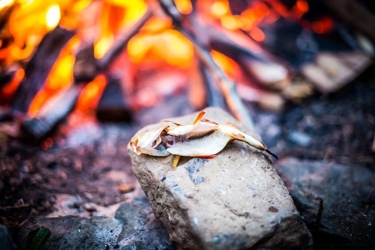Fisch wird auf einem Stein über einem offenen Feuer gegart