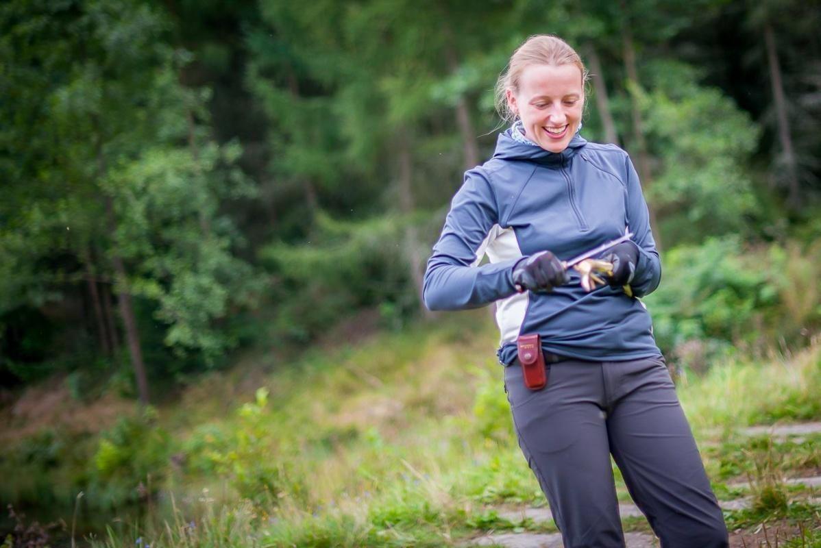 Gruppenteilnehmer analysieren Karten im Wald, Rucksäcke liegen auf dem Boden