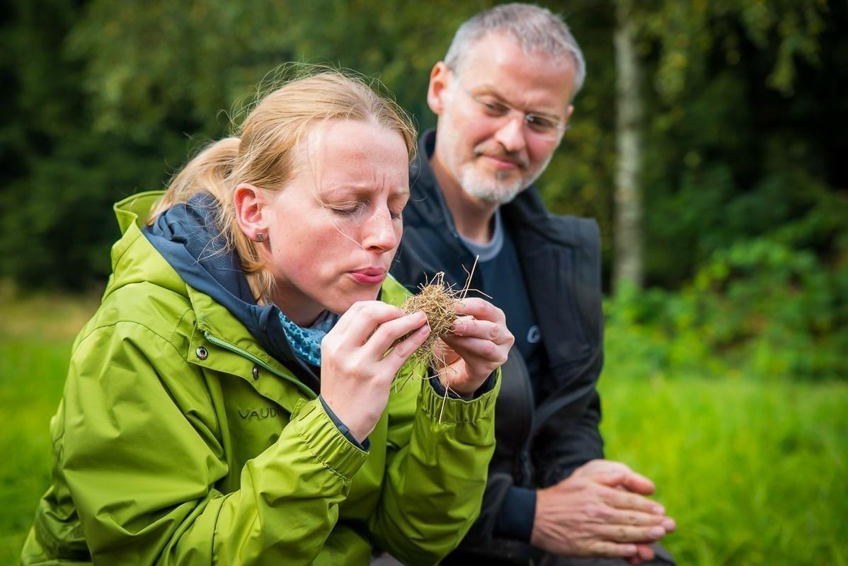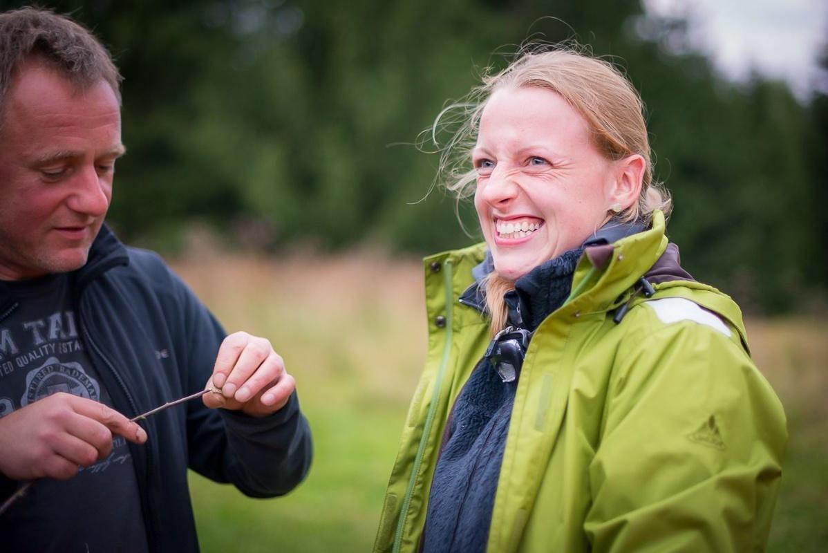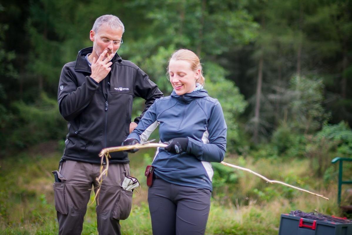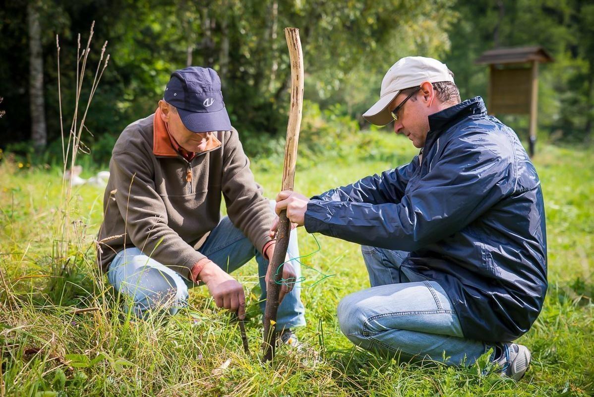 Zwei Personen betrachten gemeinsam einen langen Stock im Wald