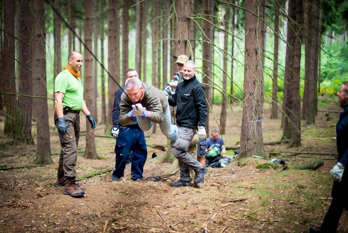 Gruppe von Personen in einem Wald, die sich auf eine Aktivität vorbereiten