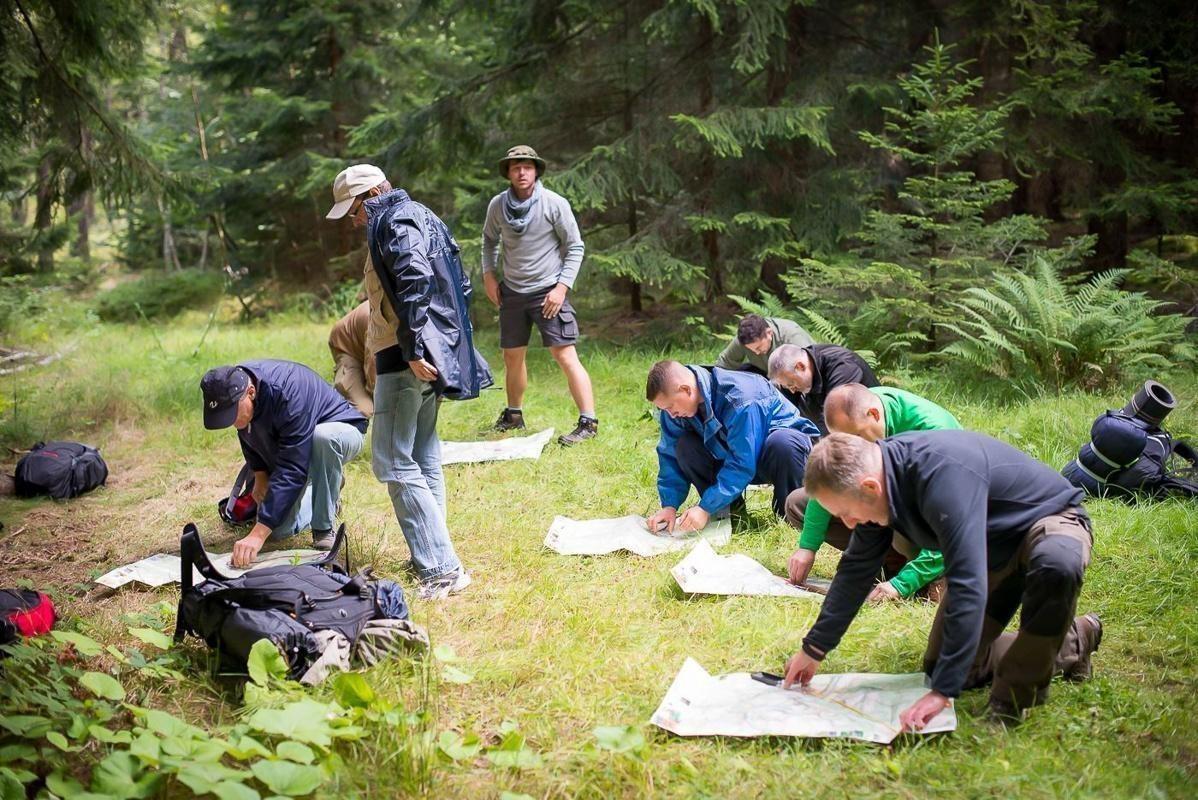 Gruppierung von Personen betrachtet Karten auf dem Boden im Wald