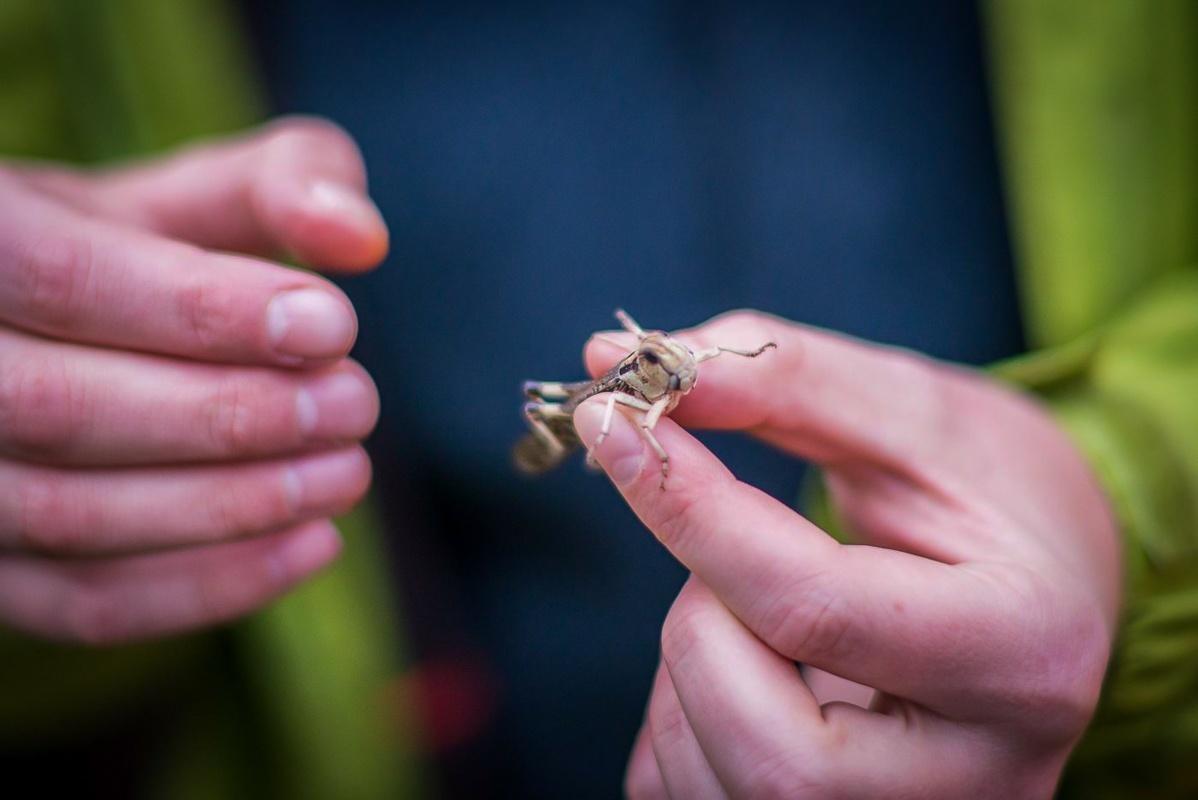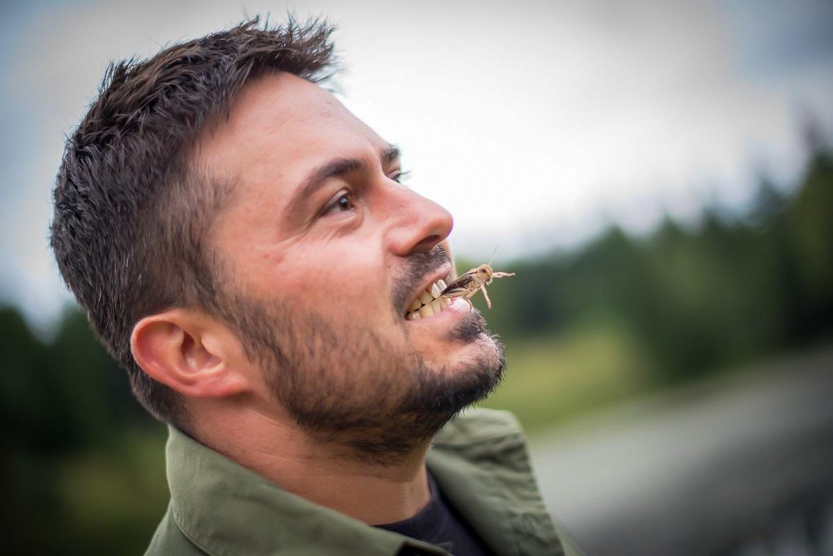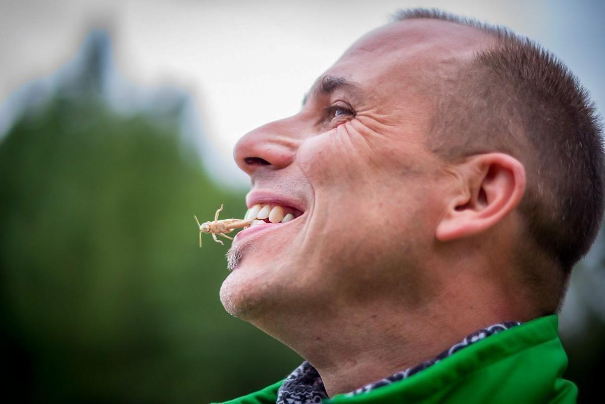 Mann hält eine Heuschrecke im Mund und schaut nach oben