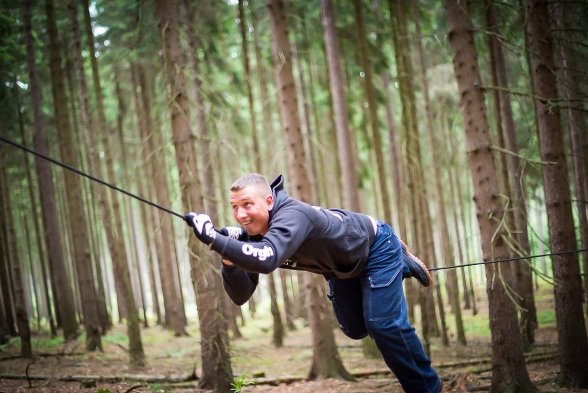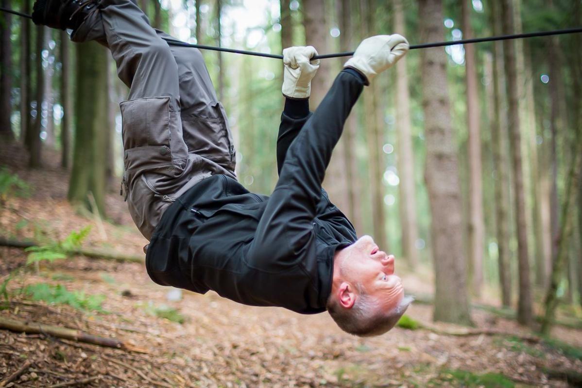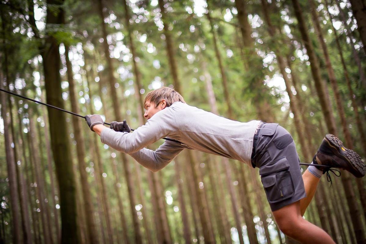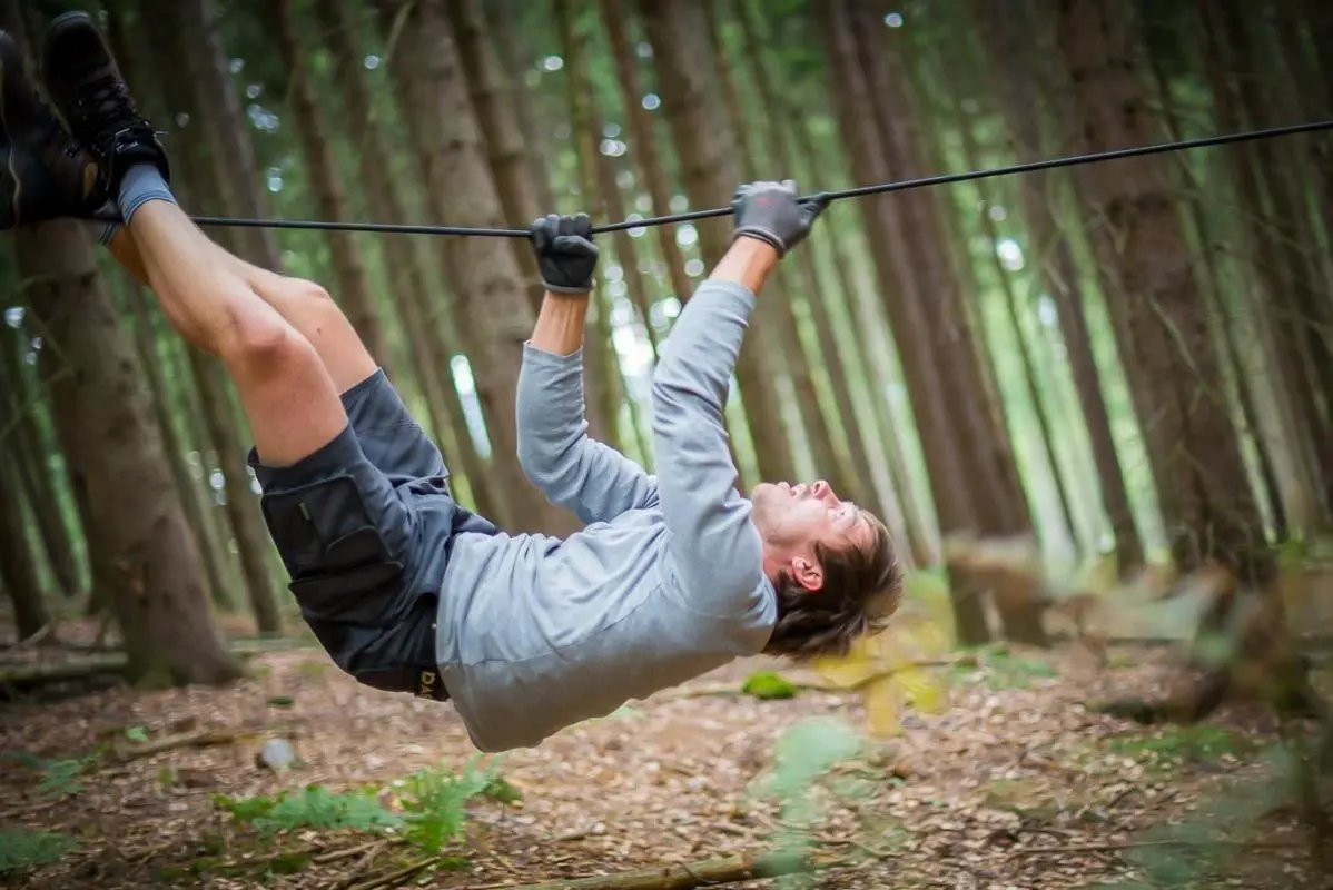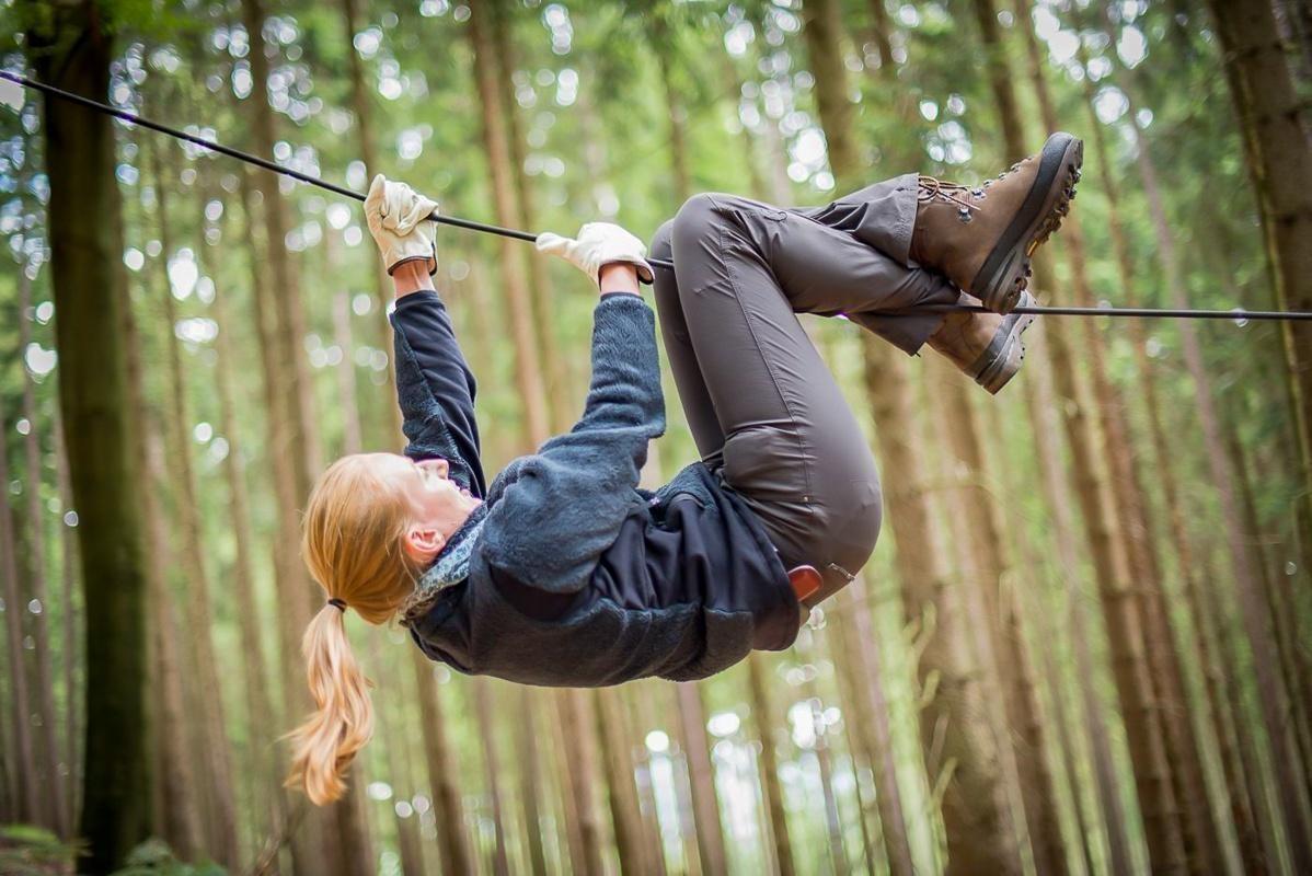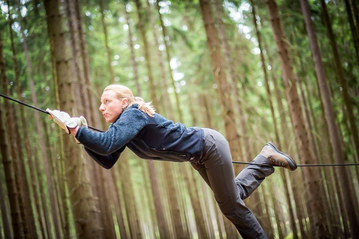 Selbstgebaute Seilquerung wird von einer Person überquert