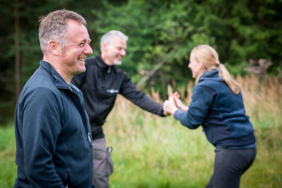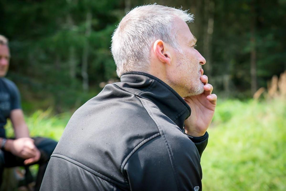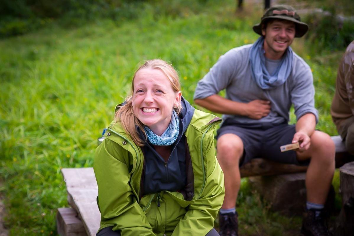 Gruppendiskussion im Freien, Teilnehmer tragen Regenjacken und lachen