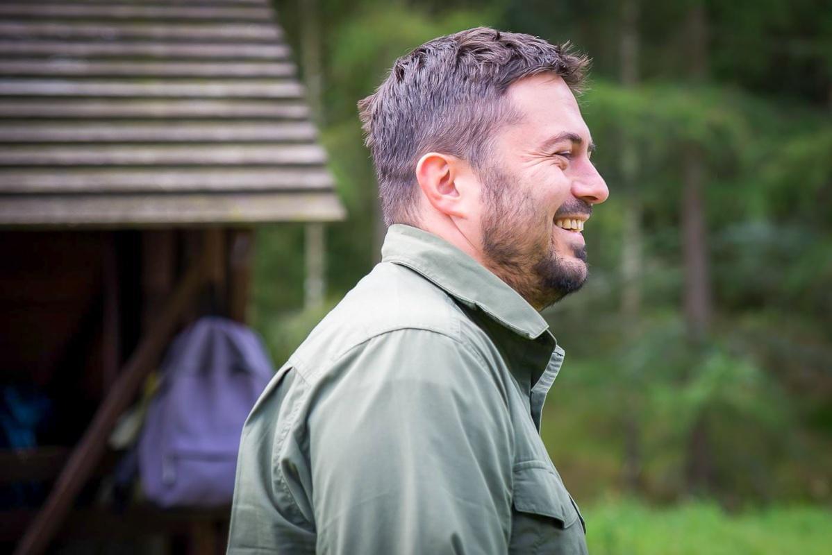Mann mit Bart in schwarzem Shirt steht vor grünen Bäumen