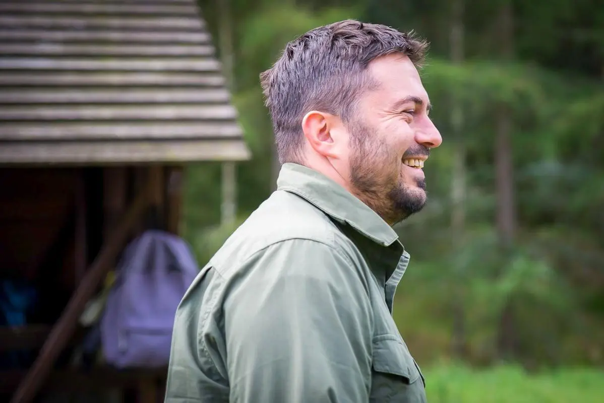 Lächelnde Person steht neben einer Holzstruktur im Wald