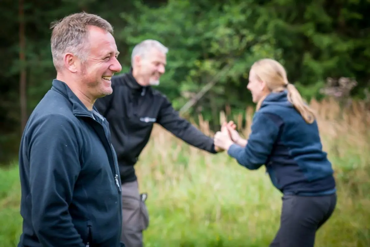 Drei Personen helfen sich gegenseitig in einer Wiese, eine Person beugt sich vor