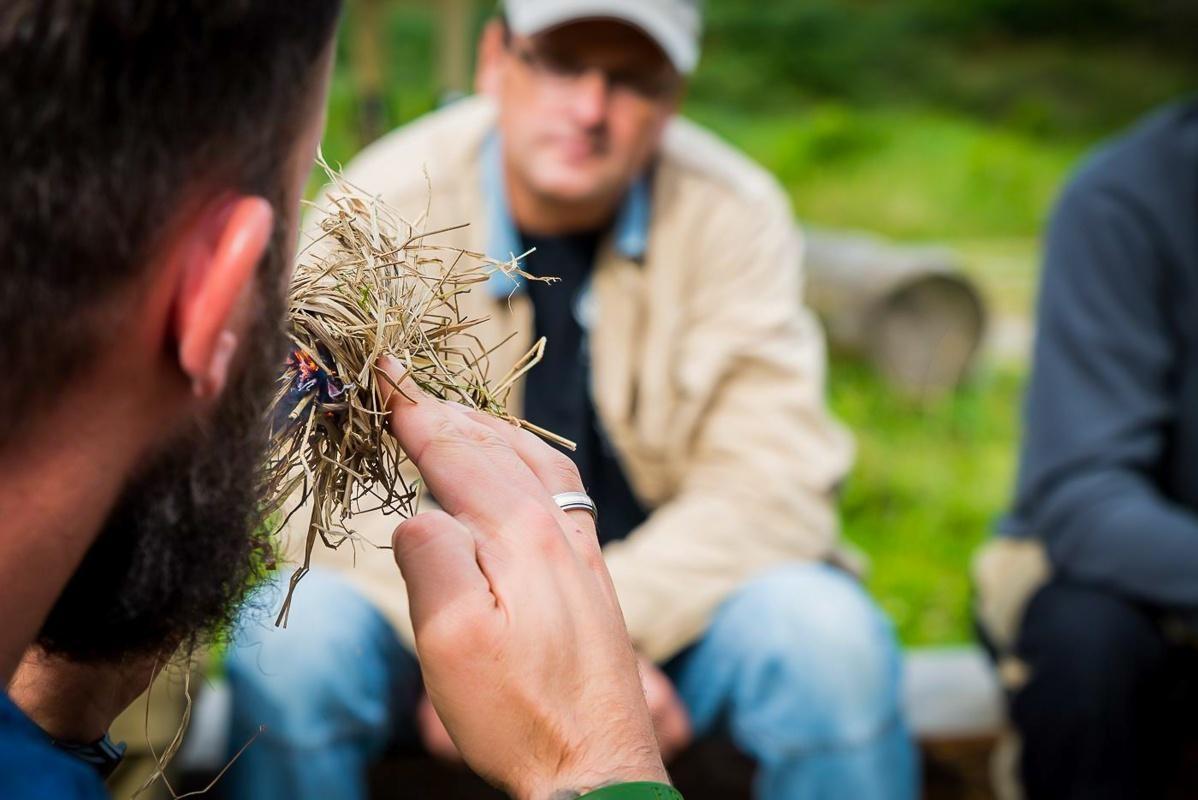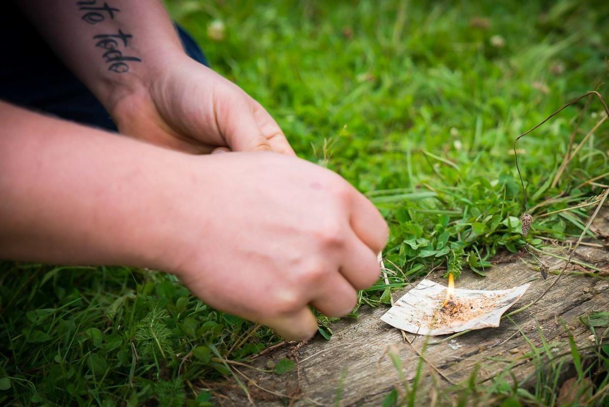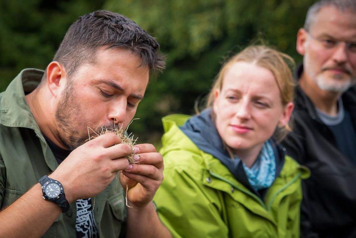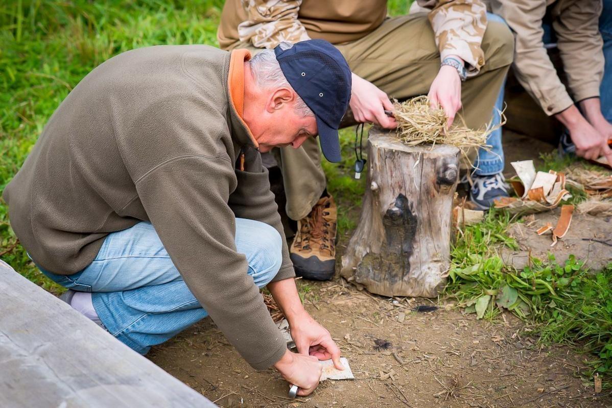 Drei Personen knien im Gras und bereiten Zunder auf einem Holzstück vor