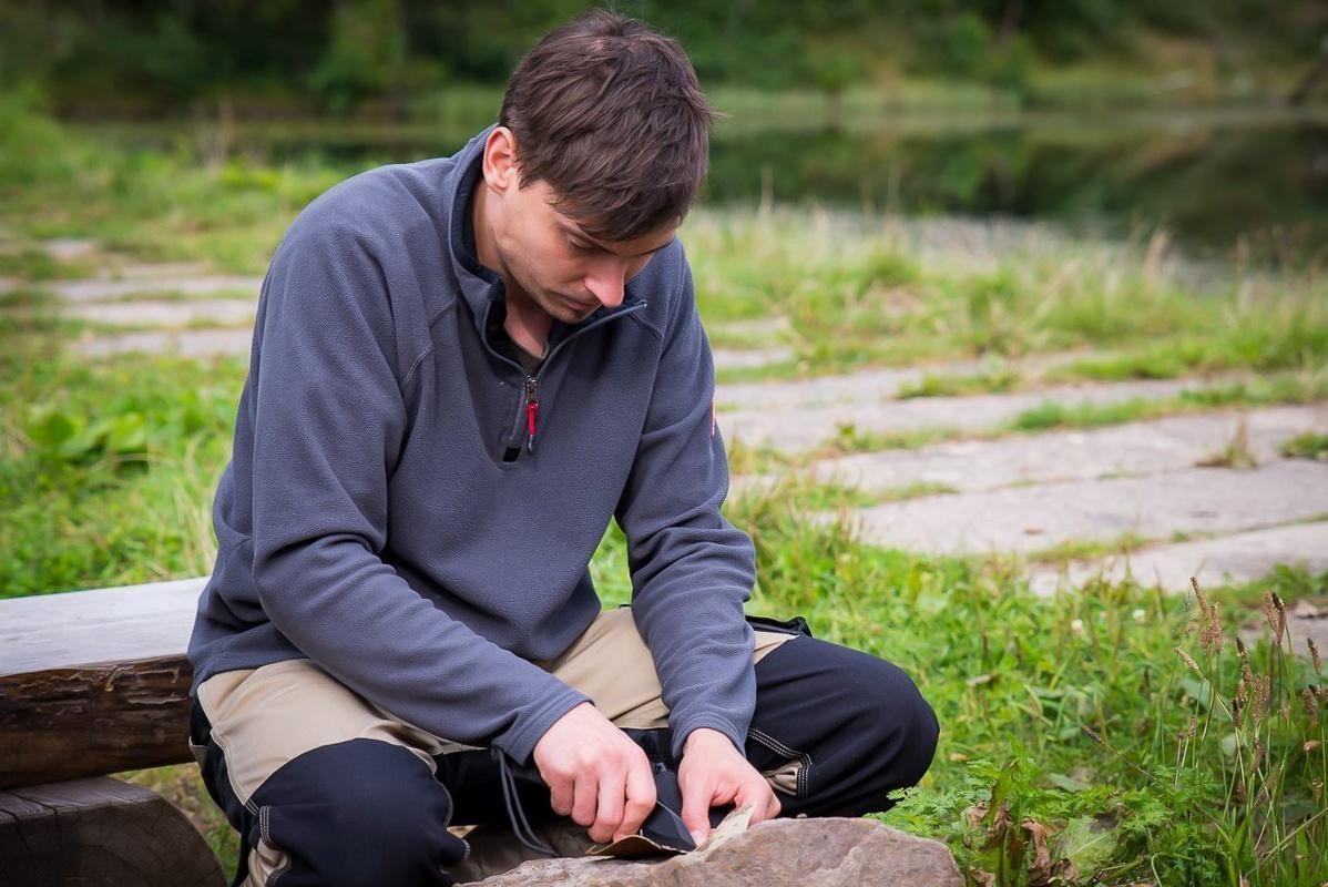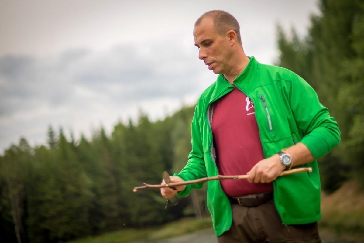 Mann schnitzt einen Stock am Ufer eines Gewässers, zwei weitere Personen im Hintergrund