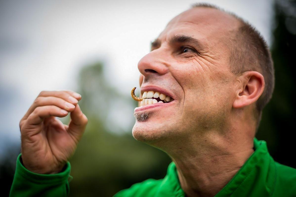 Mann hält einen Wurm zwischen den Zähnen und lächelt