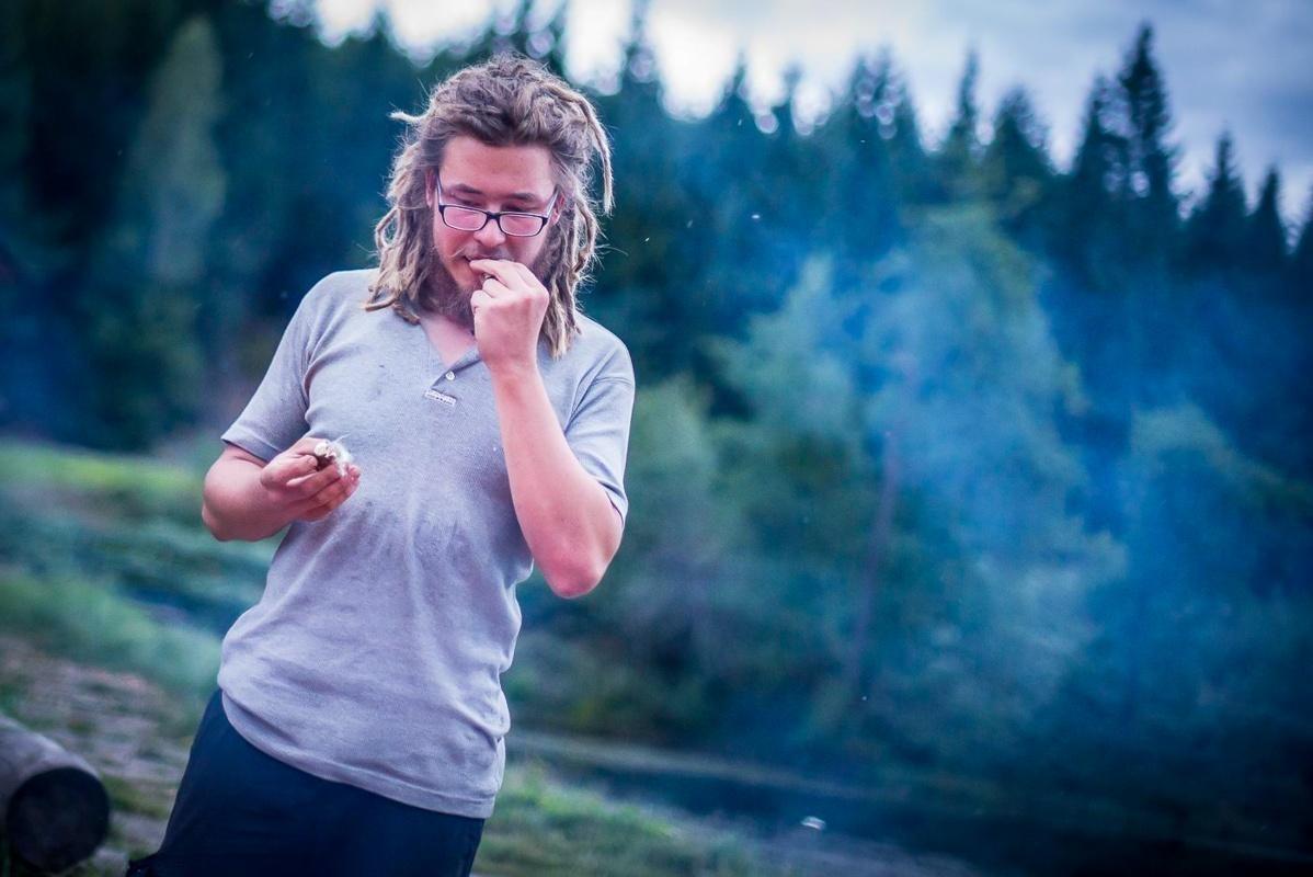 Gruppe sitzt um ein Feuer, während sie mit Stöcken Brot über den Flammen rösten