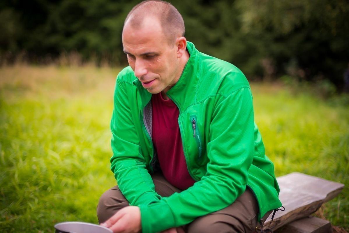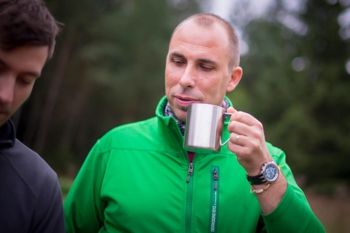 Mann in grüner Jacke hält einen Metallbecher und schaut nachdenklich