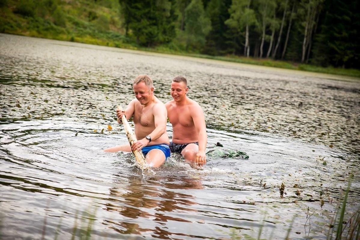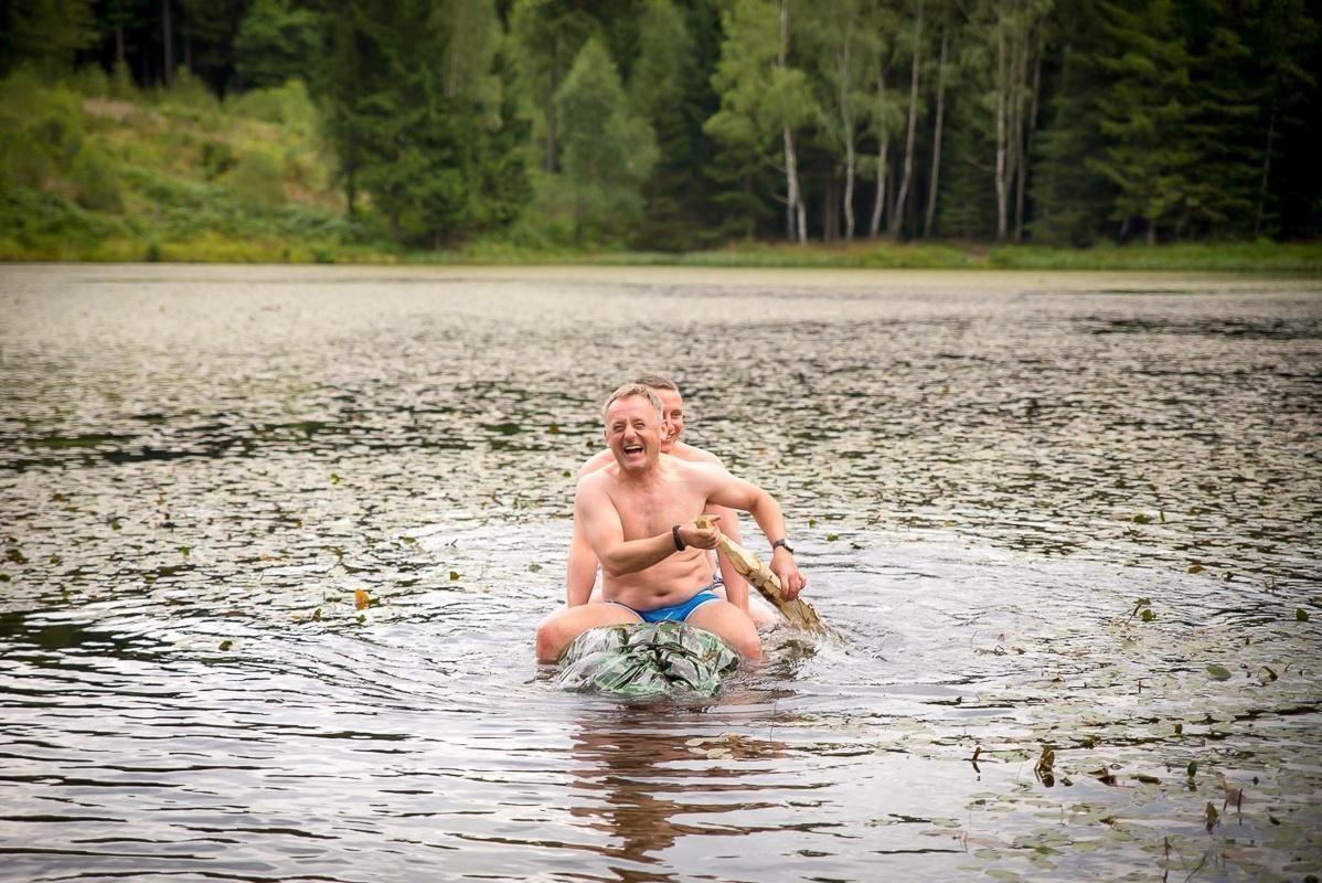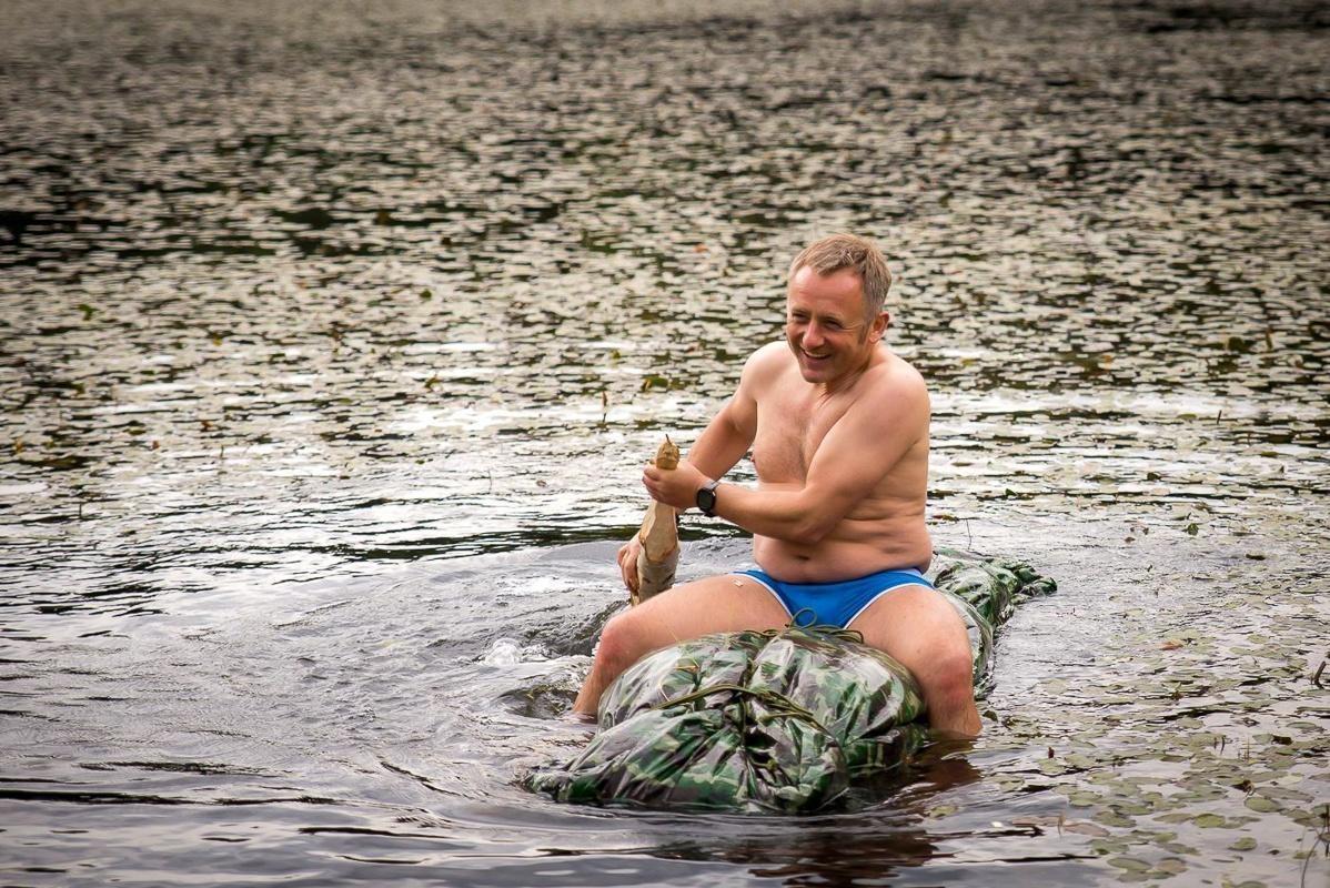 Mann sitzt auf einem camouflagefarbenen Objekt im Wasser und hält einen Stock