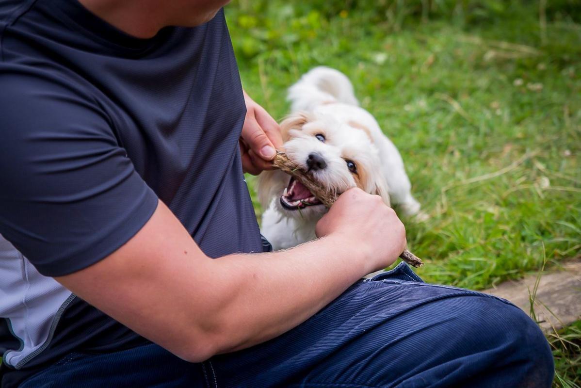 Mann spielt mit einem Welpen, der an einem Stock zieht