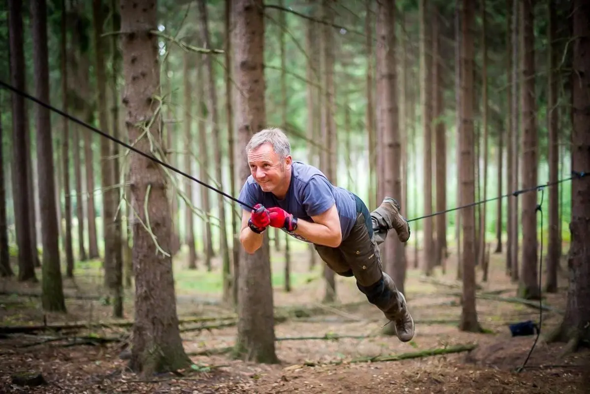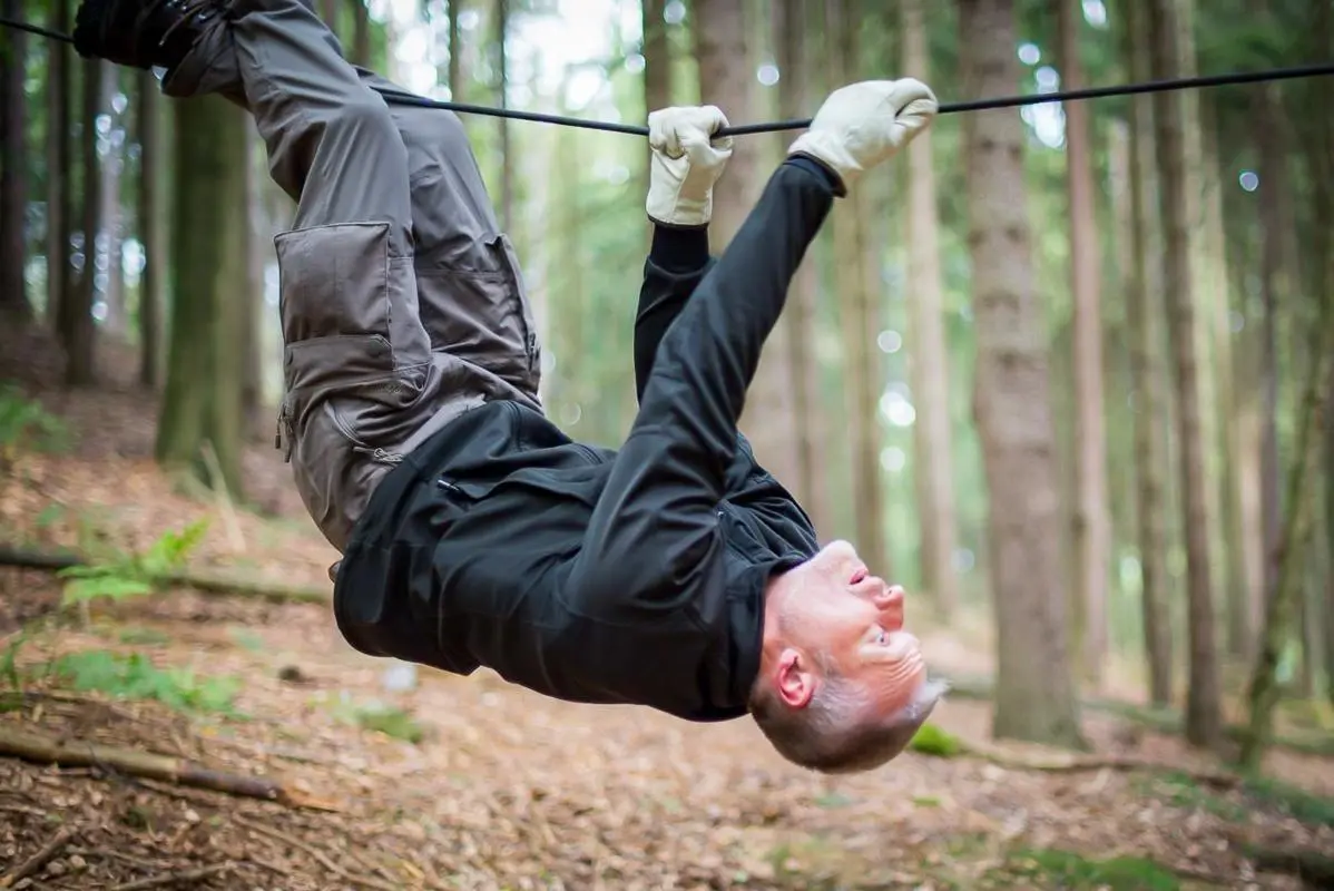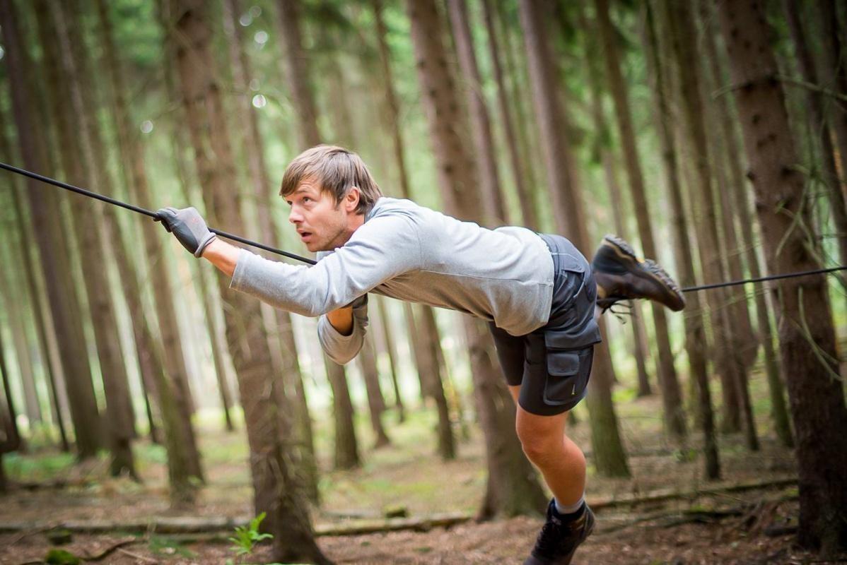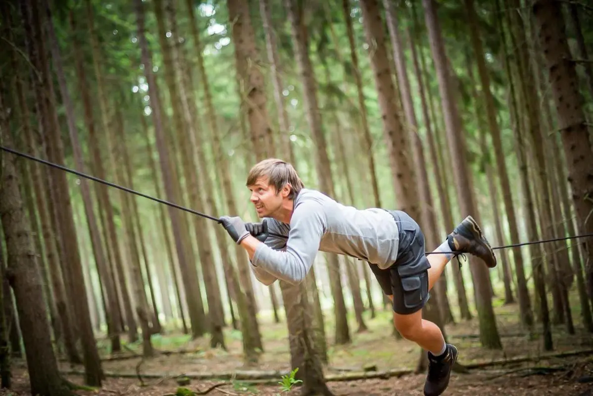 Mann überquert selbstgebaute Seilbrücke im Wald, während ein anderer zuschaut