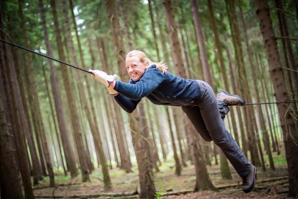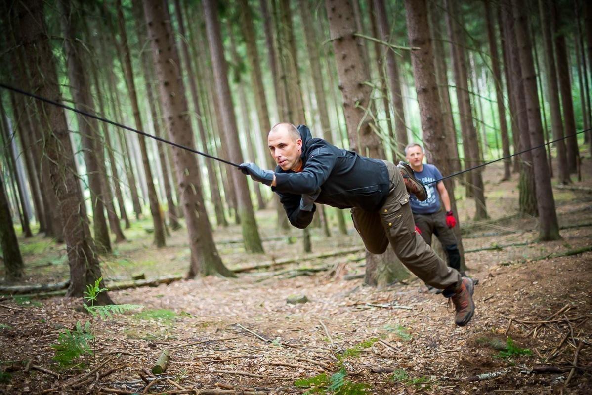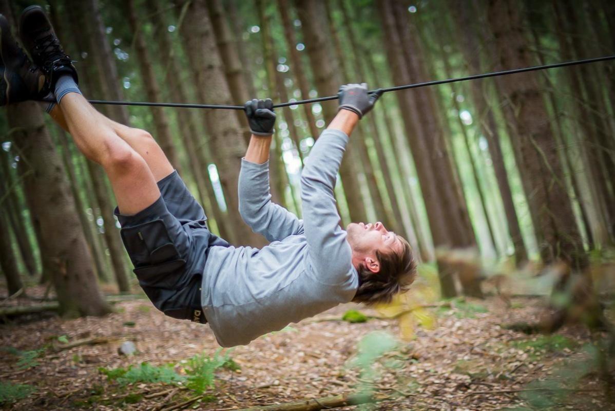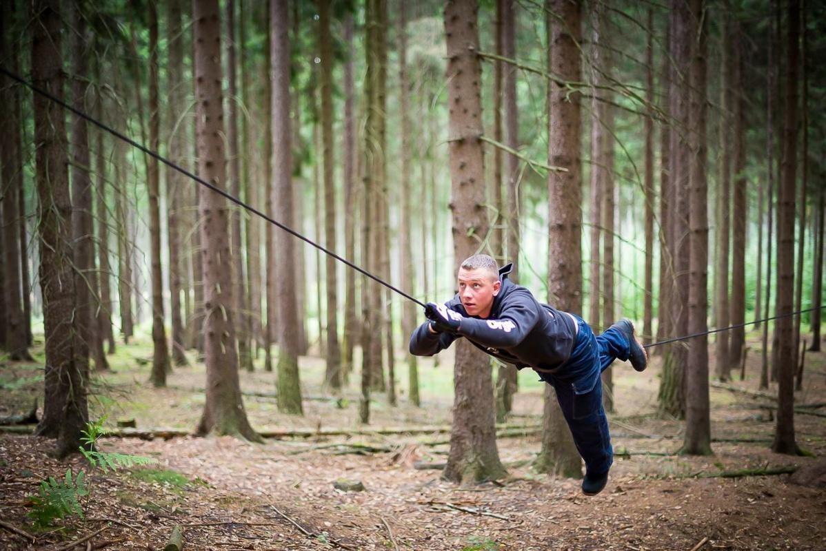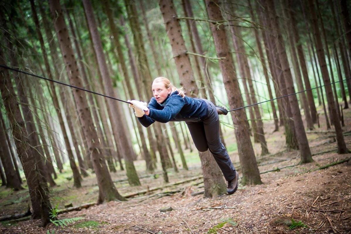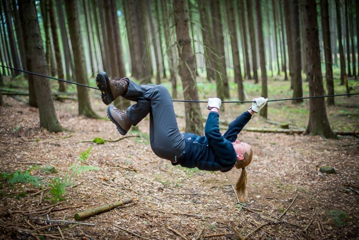 Selbstgebaute Seilquerung wird über den Waldboden überwunden