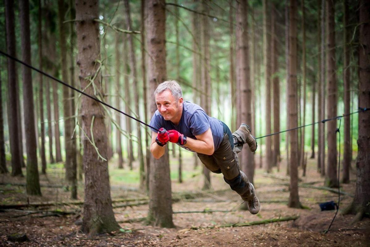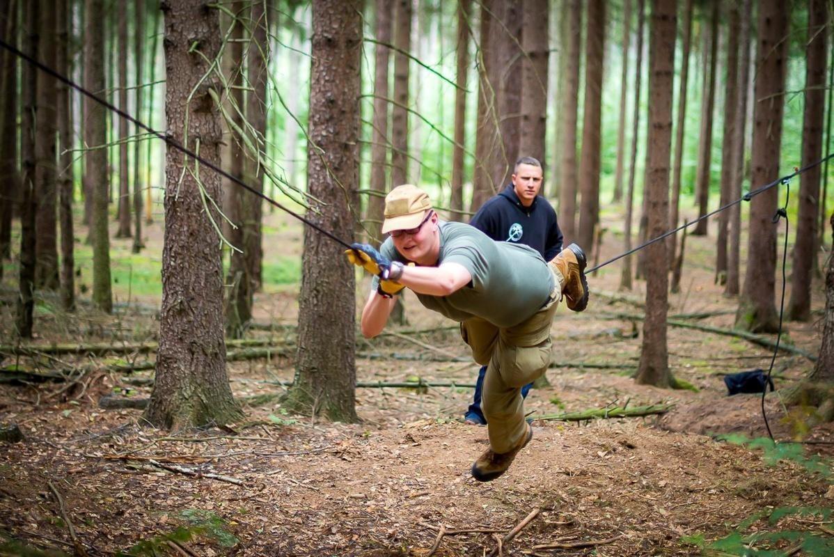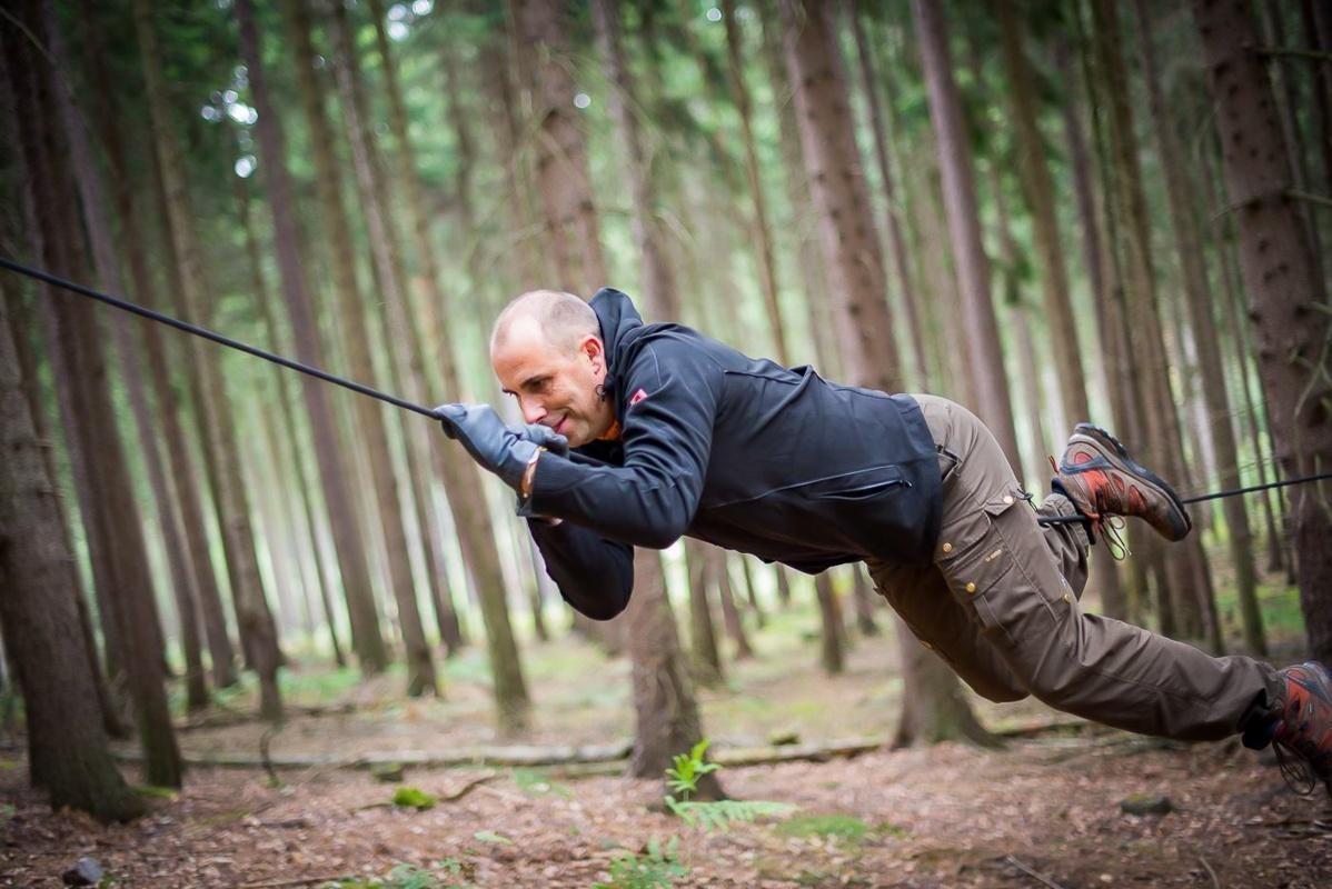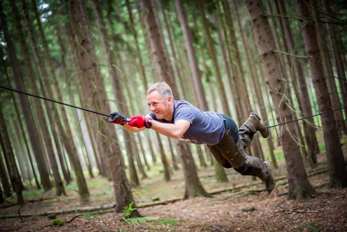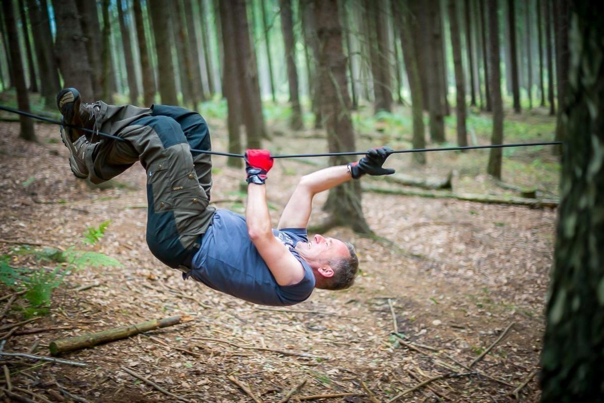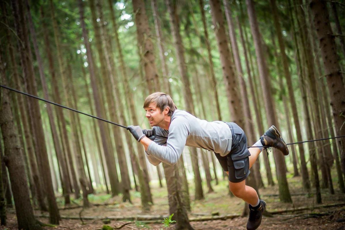 Selbstgebaute Seilquerung wird über den Waldboden überwunden
