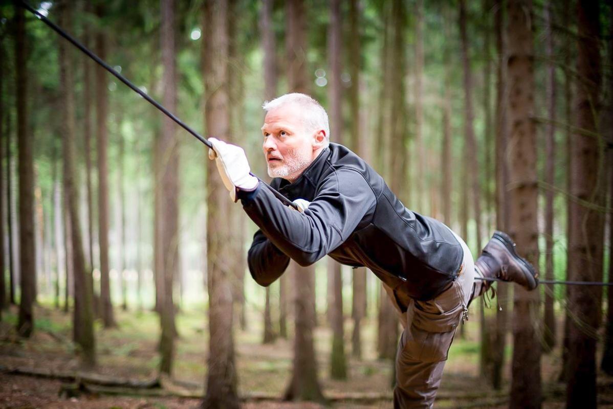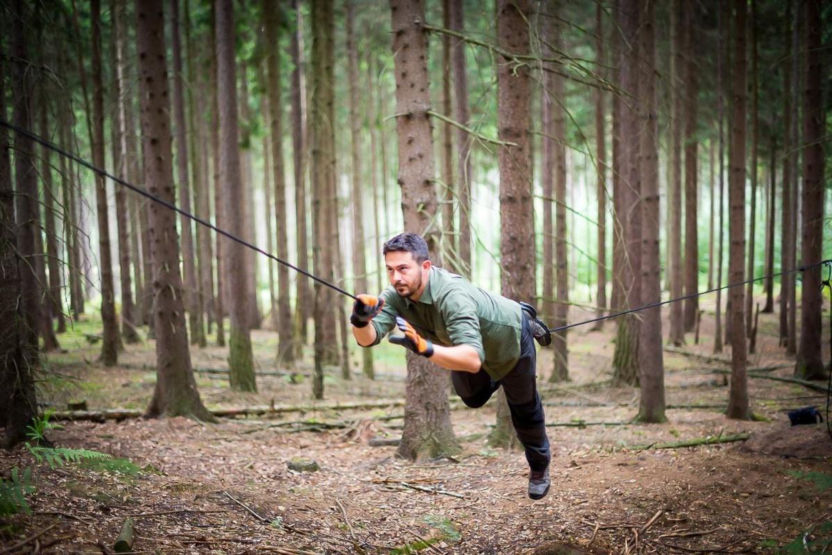 Mann überquert selbstgebaute Seilbrücke zwischen zwei Bäumen im Wald