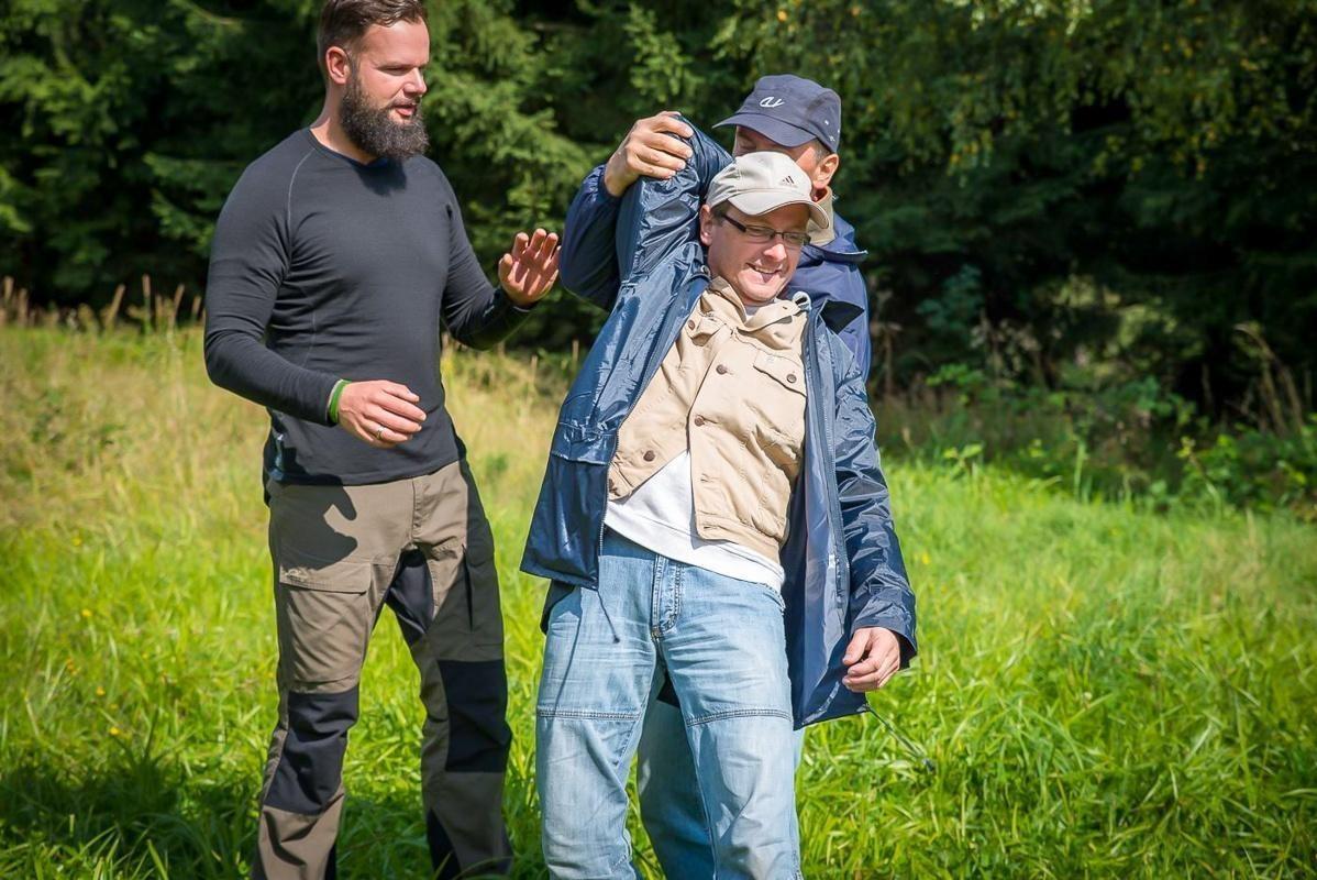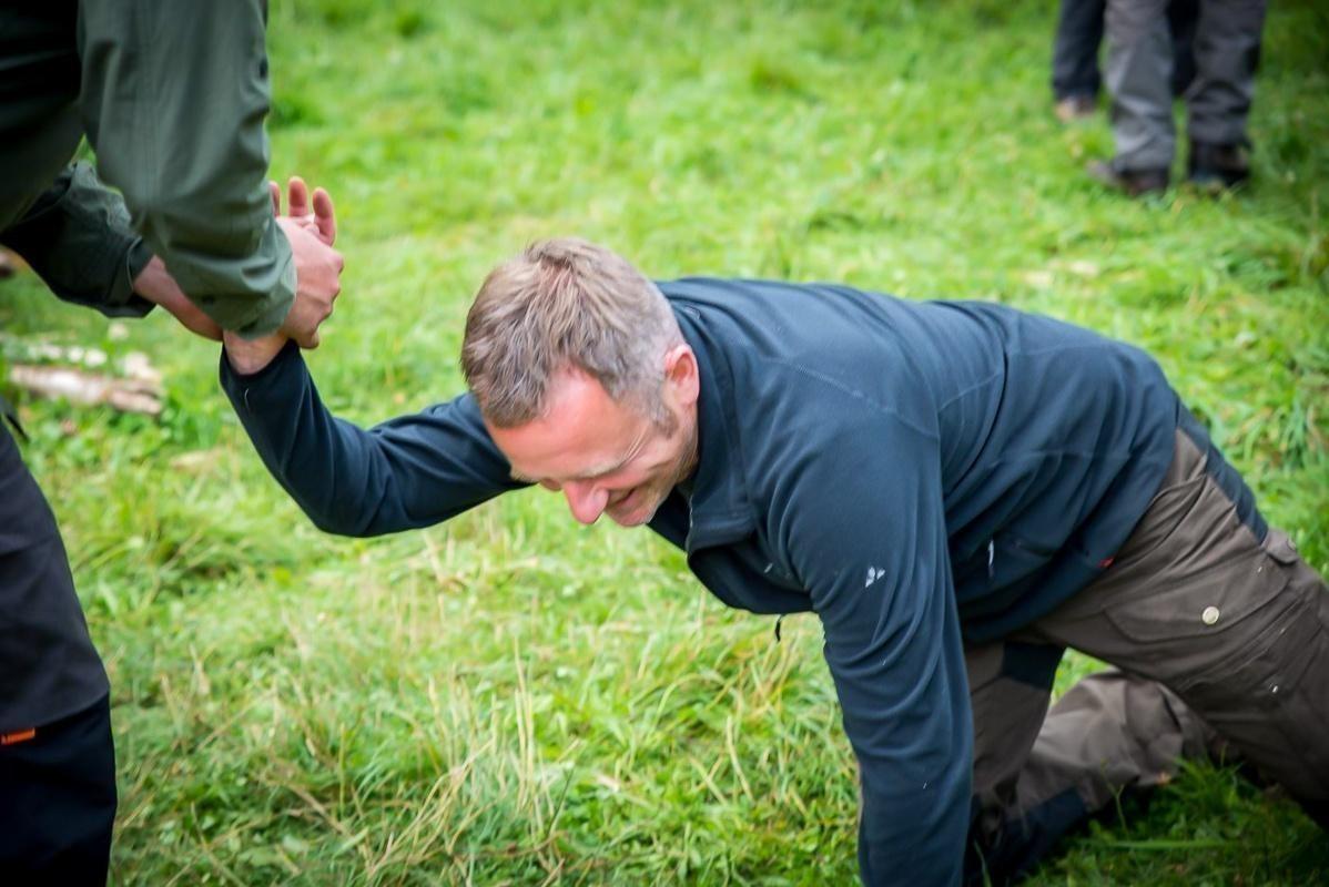 Ein Teilnehmer wird von einem anderen in einer Übung unterstützt