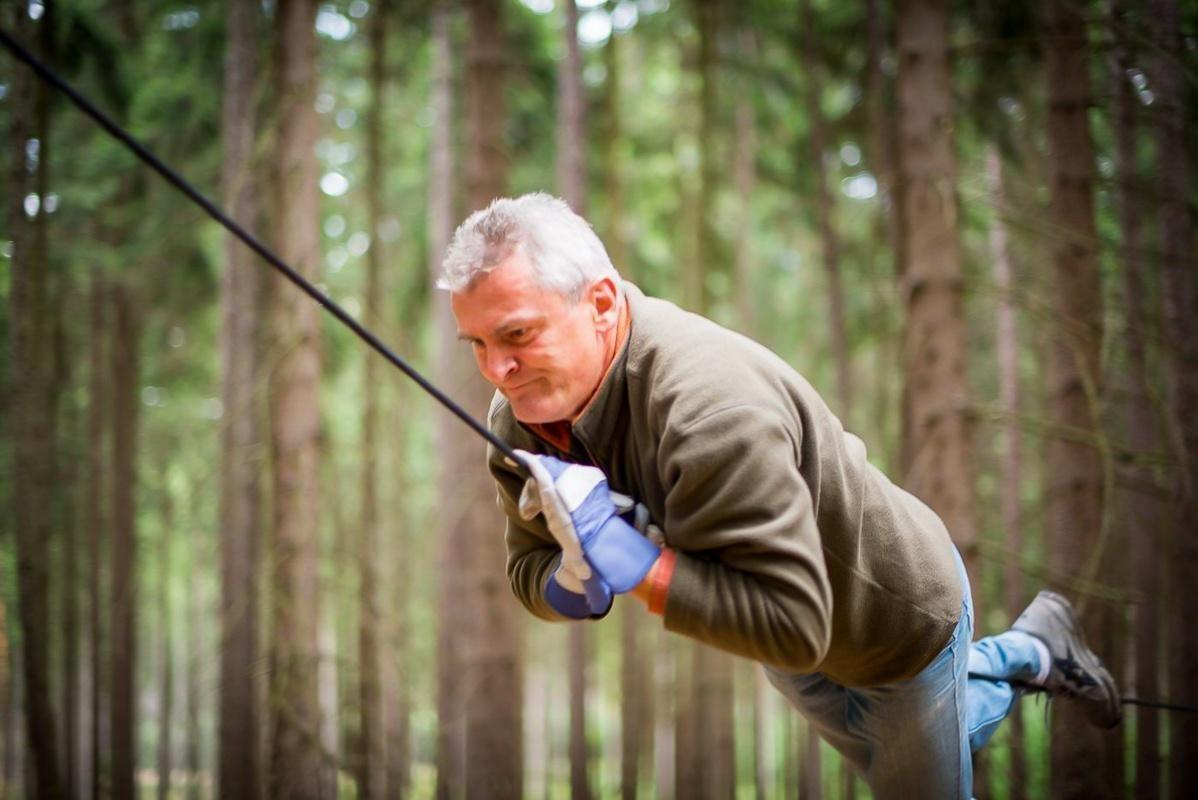 Mann überquert selbstgebaute Seilbrücke zwischen Bäumen im Wald