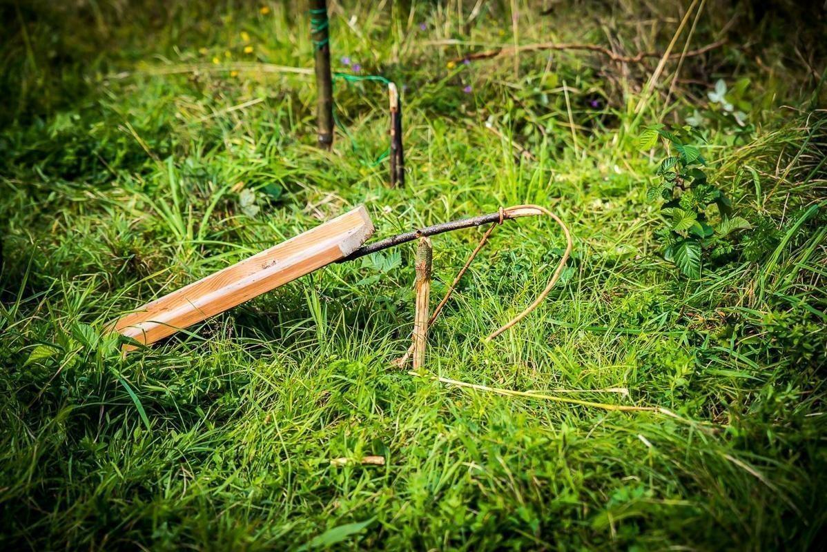 Schlingenfalle aus Holz und Schnur im hohen Gras aufgebaut