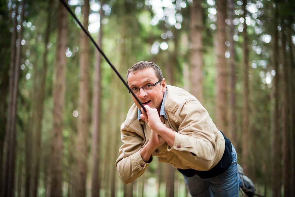 Mann überquert selbstgebaute Seilbrücke in einem Waldgebiet