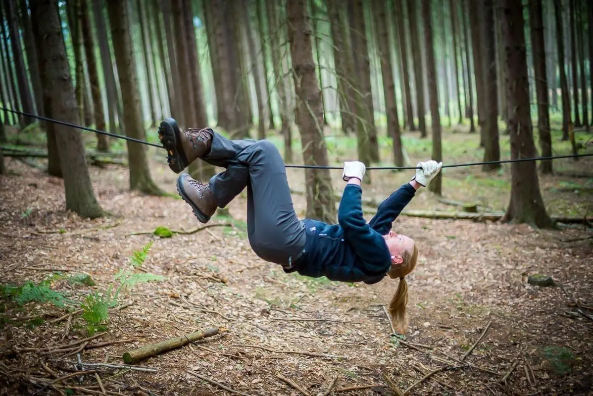 Gruppenteilnehmer überqueren eine selbstgebaute Seilbrücke im Wald