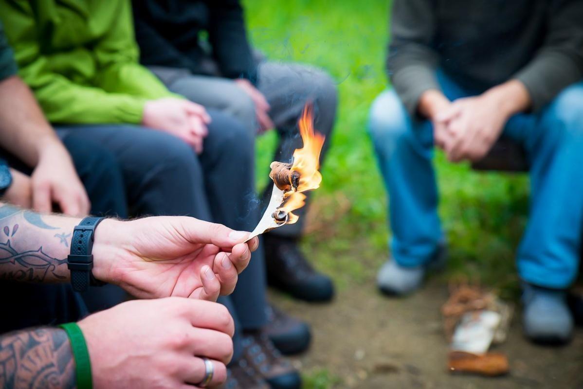 Zunder brennt in der Hand, während Personen im Hintergrund sitzen