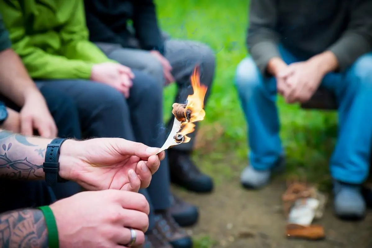 Zunder glimmt und raucht in der Hand, während Zuschauer aufmerksam beobachten