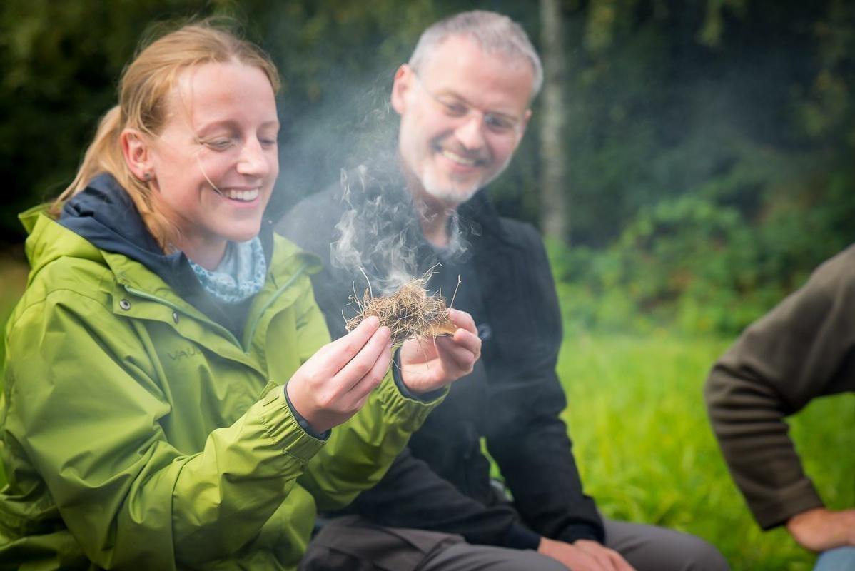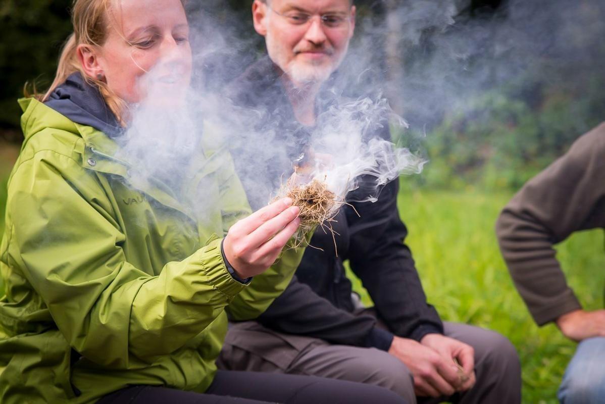 Frau bläst in ein Zundernest, Mann beobachtet aufmerksam