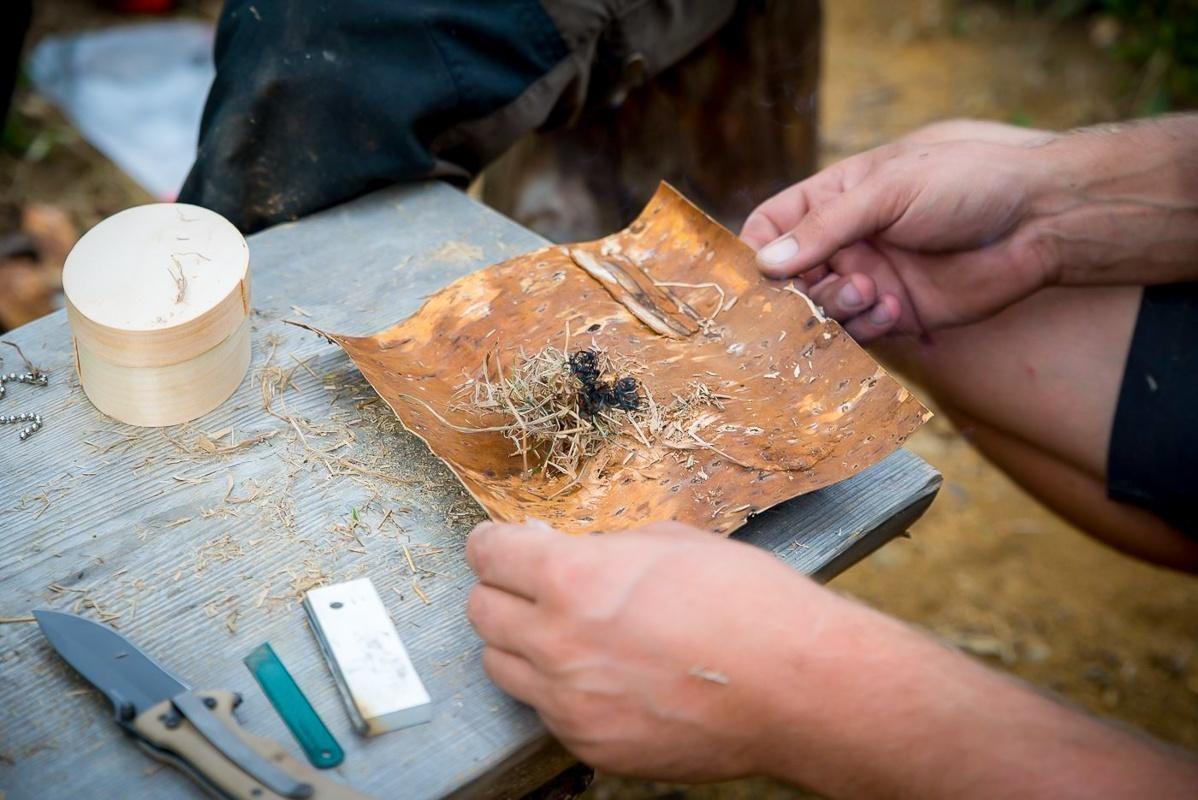 Zunder wird mit einem Messer auf einem Baumstumpf vorbereitet