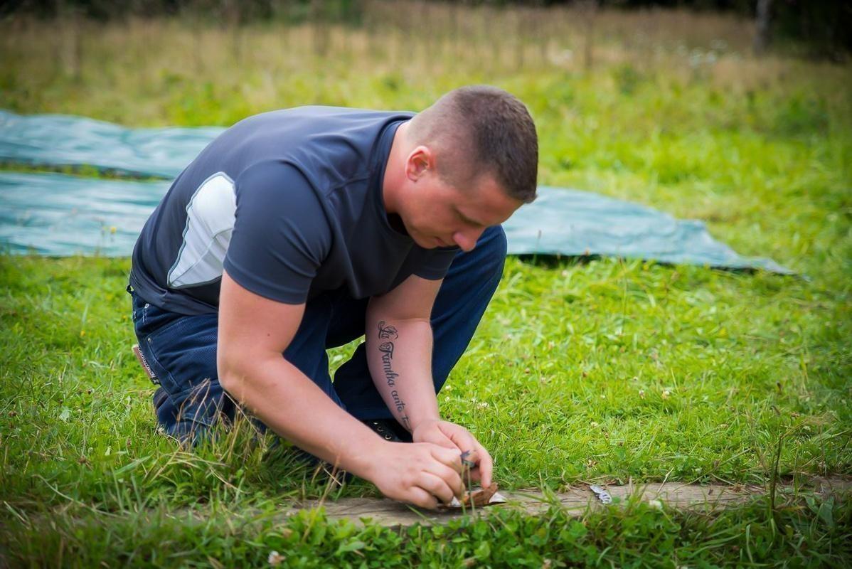 Mann kniet im Gras und bindet zwei Äste mit einer Schnur zusammen
