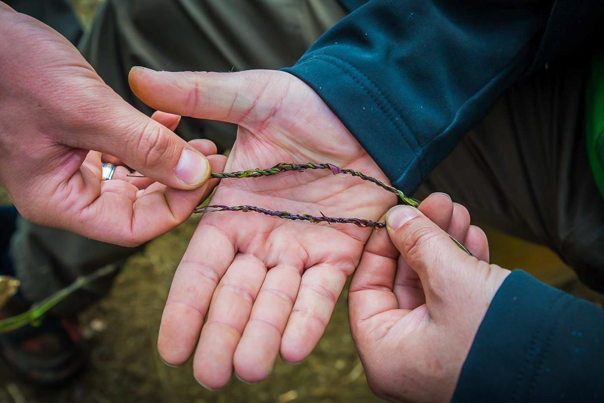 Zwei Hände flechten Pflanzenmaterial zu einer Schnur