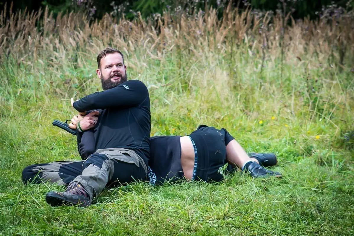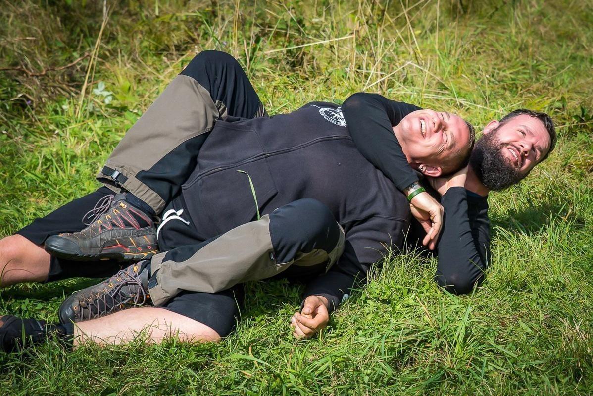 Zwei Personen liegen im Gras, eine Person hält die andere in einer kontrollierenden Position