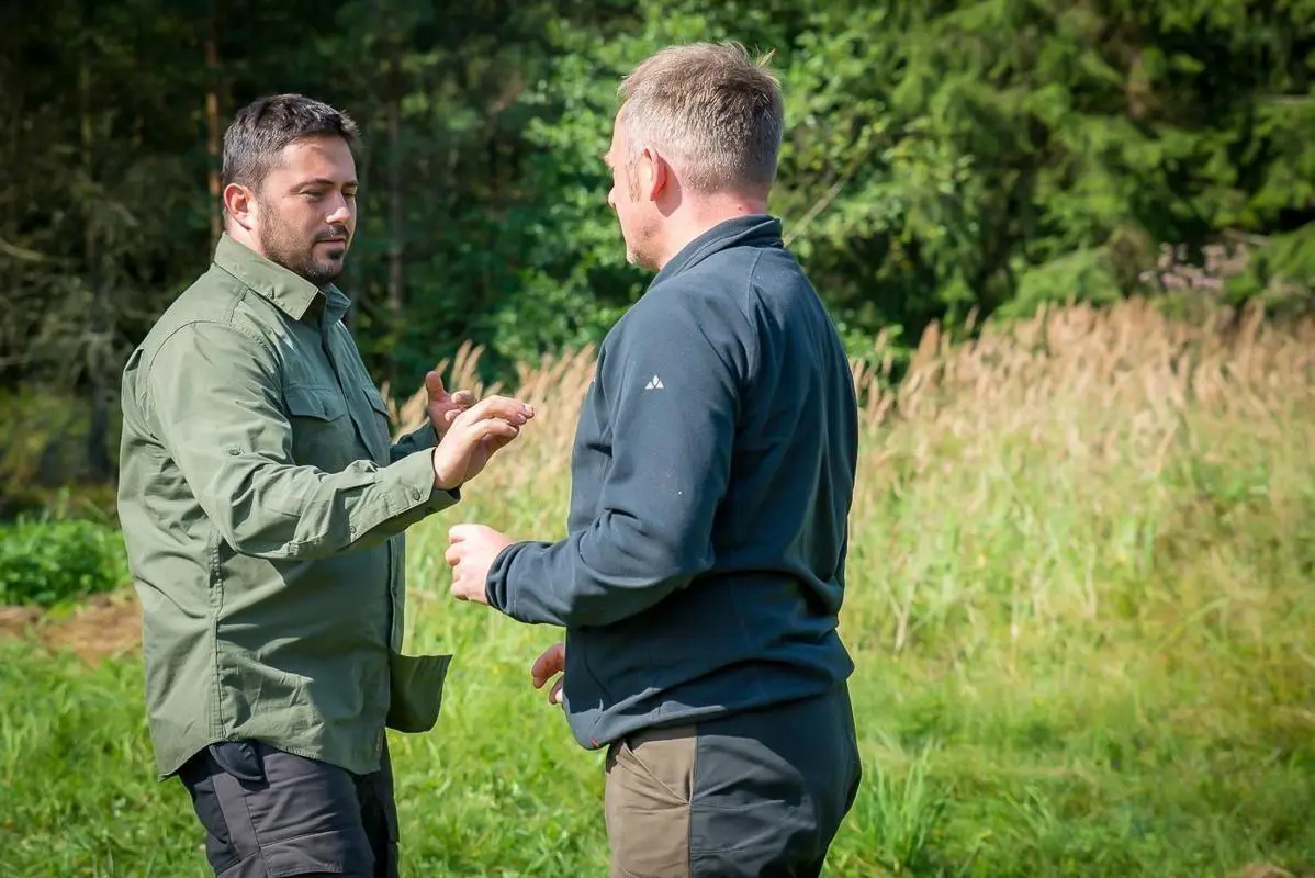 Zwei Personen stehen in einer Wiese und führen eine Übergabe durch
