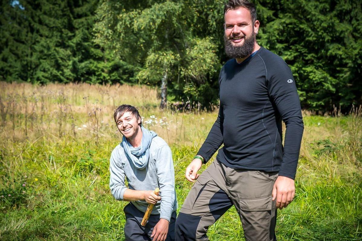 Zwei Männer zeigen Daumen hoch und halten einen selbstgebauten Stock mit Spitzen