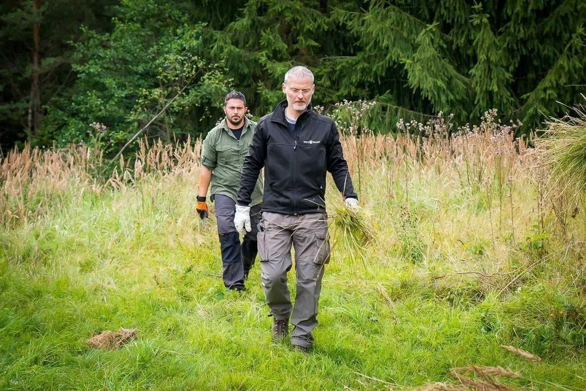 Zwei Personen tragen Gras und arbeiten in einer Wiese mit hohem Bewuchs