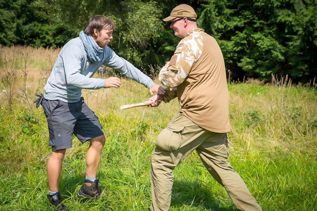 Zwei Personen üben eine Selbstverteidigungstechnik mit einem Stock im Freien