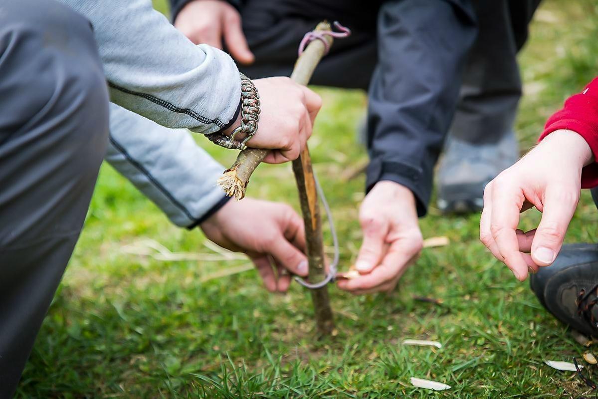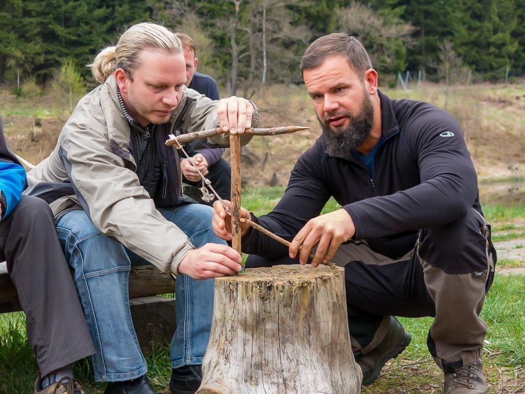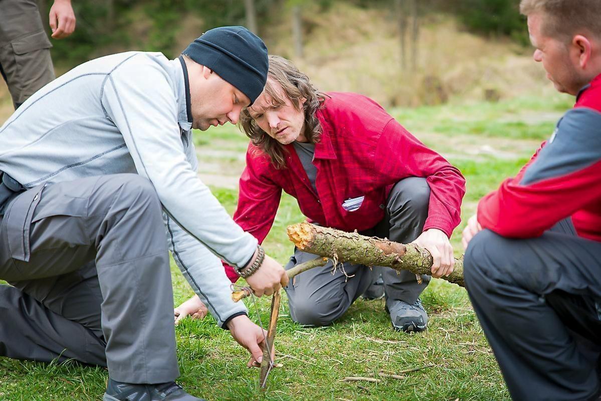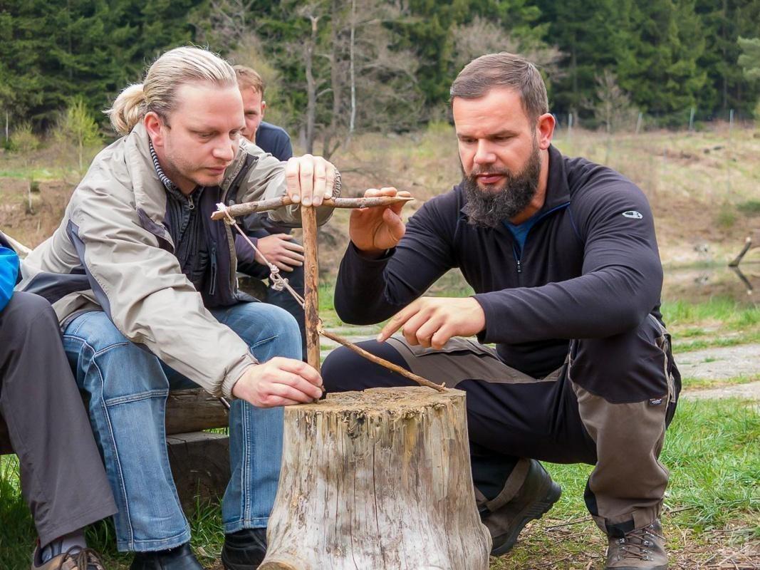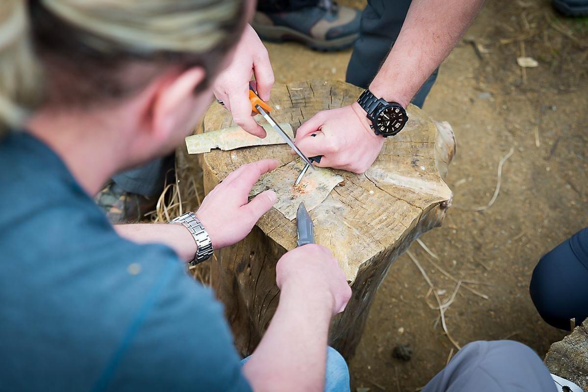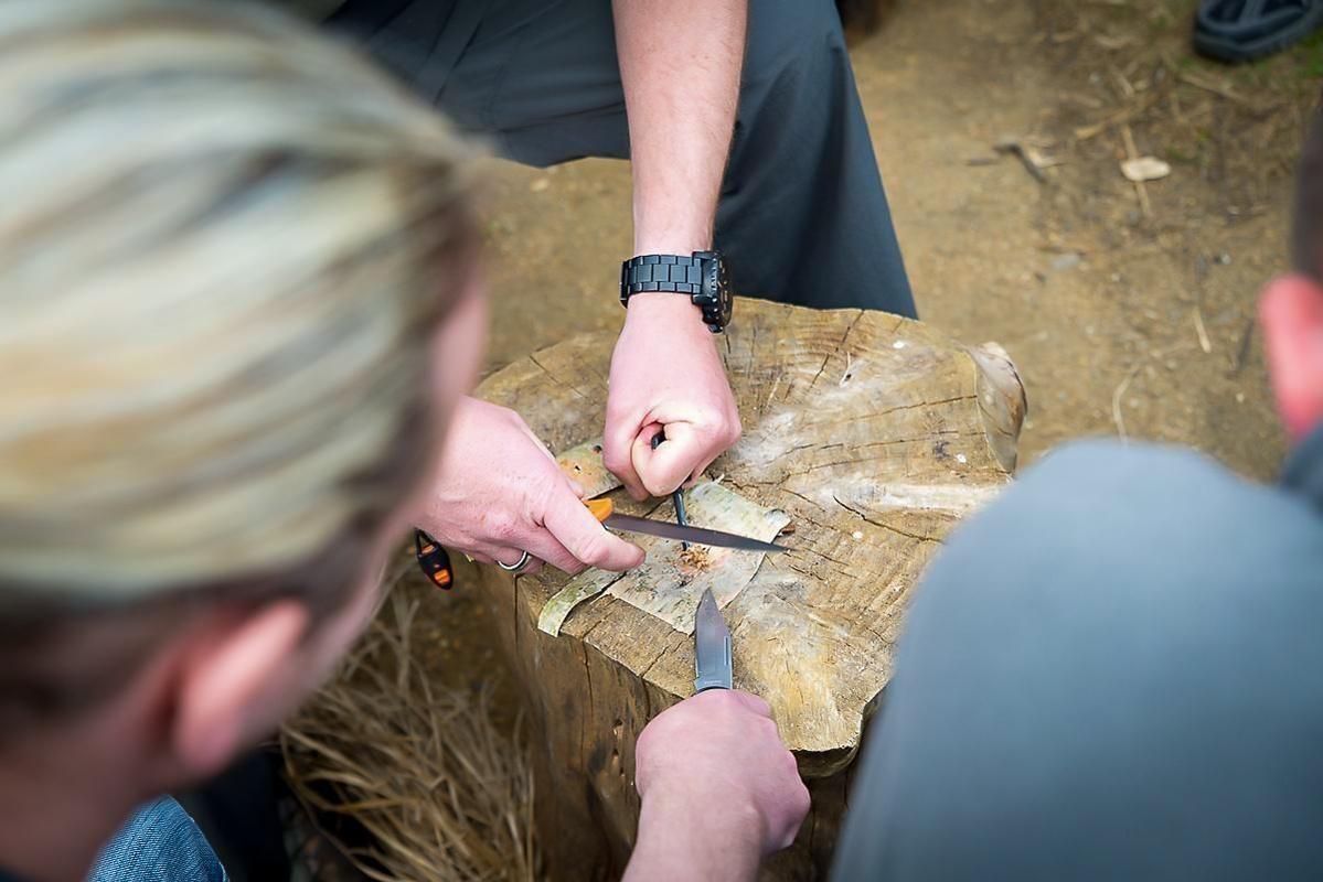 Gruppe beobachtet Anleitung zur Nutzung von Werkzeugen am Lagerfeuer