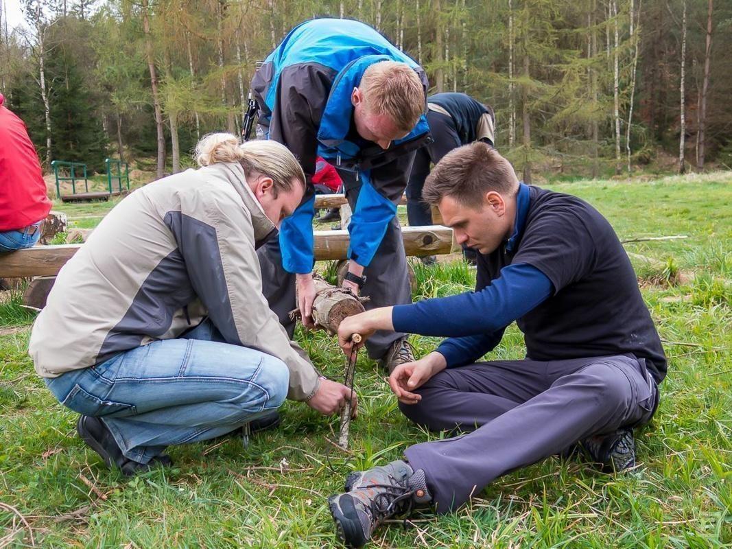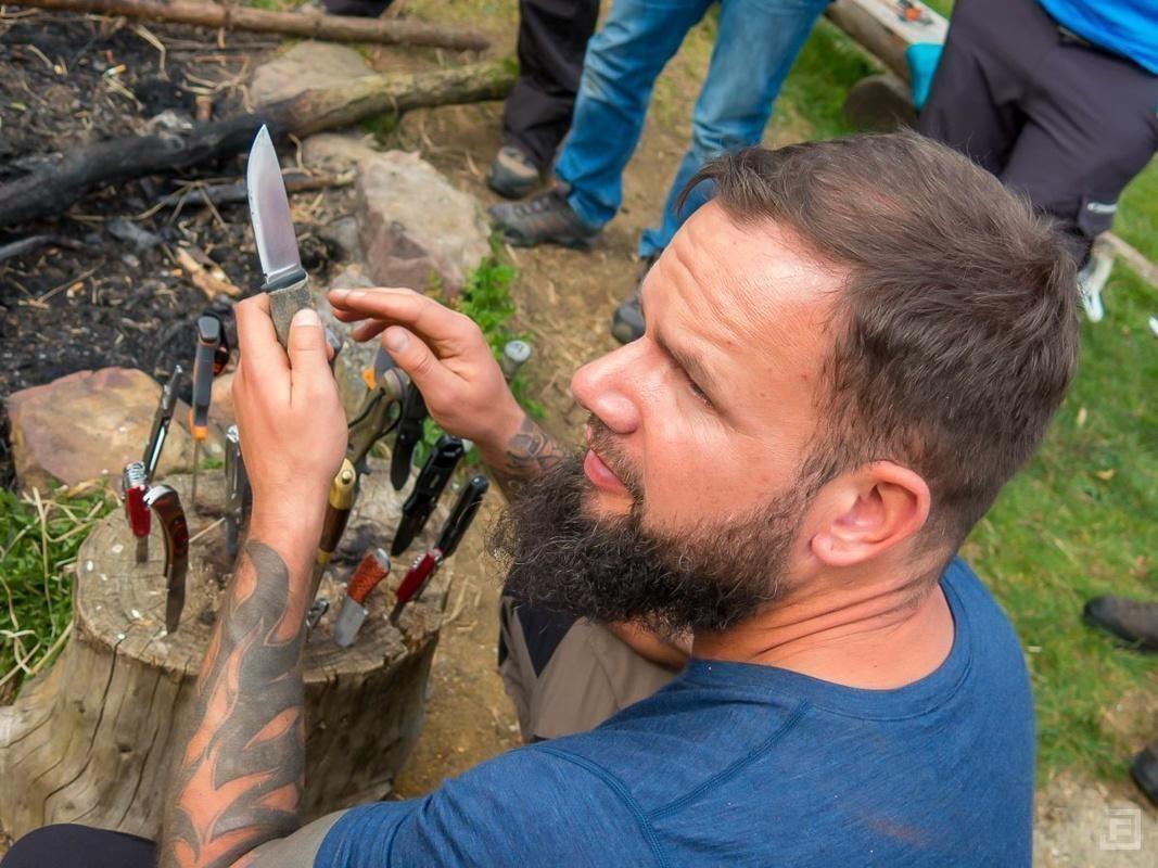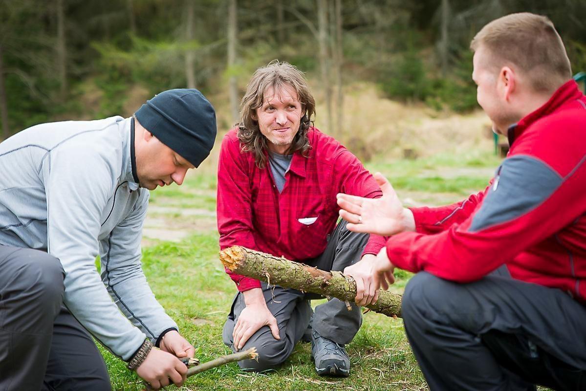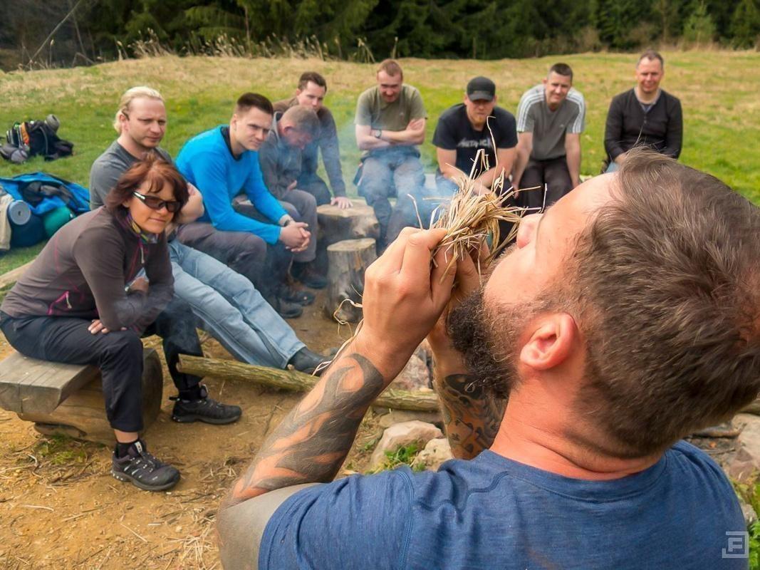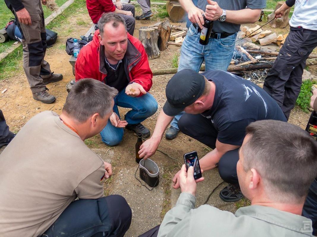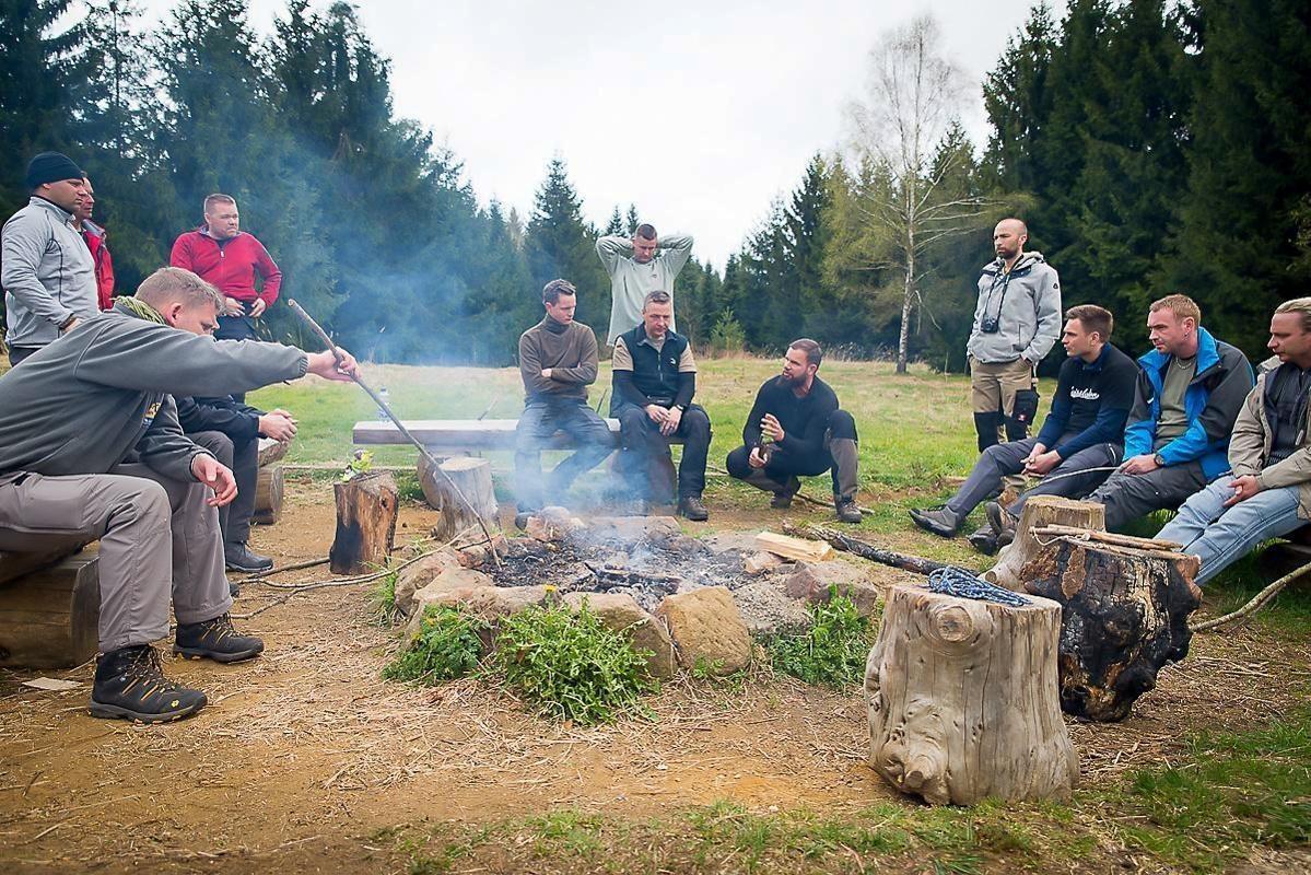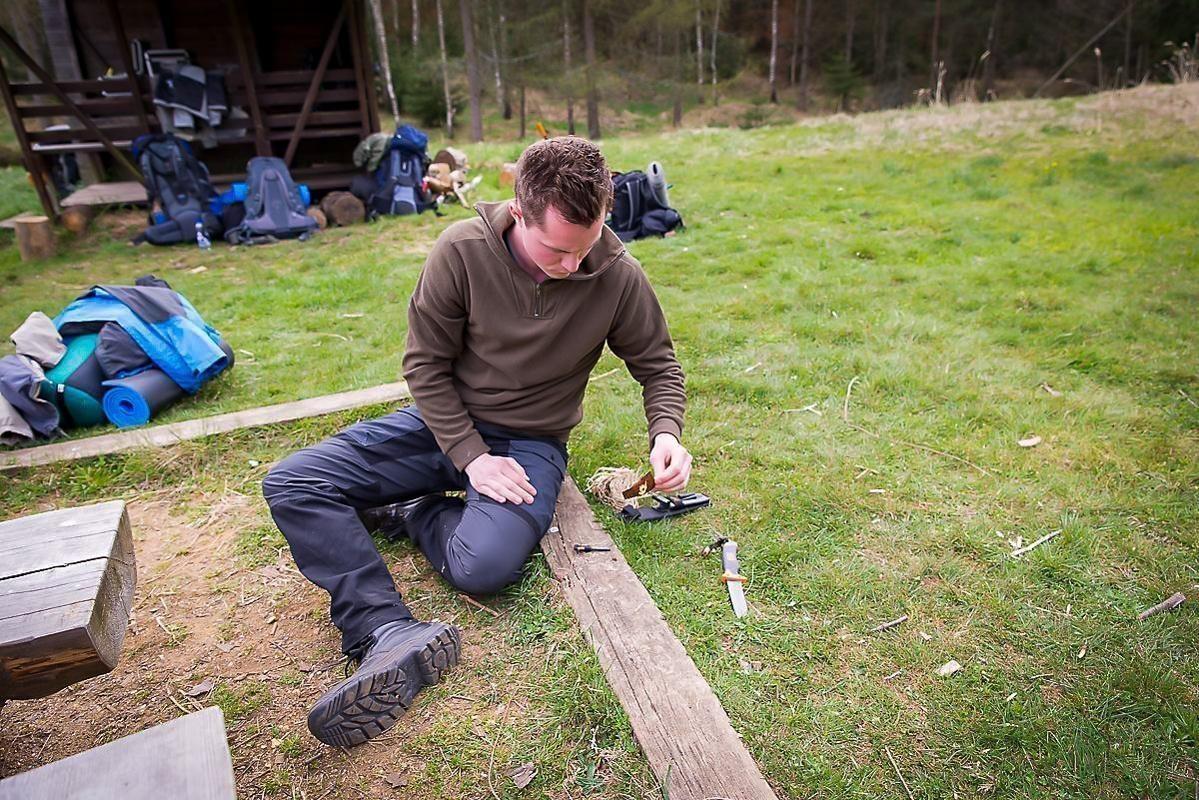 Gruppe beobachtet Anleitung zur Nutzung von Werkzeugen am Lagerfeuer