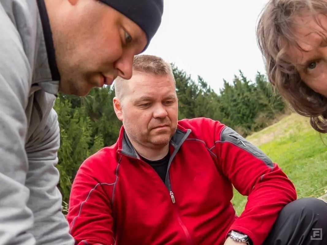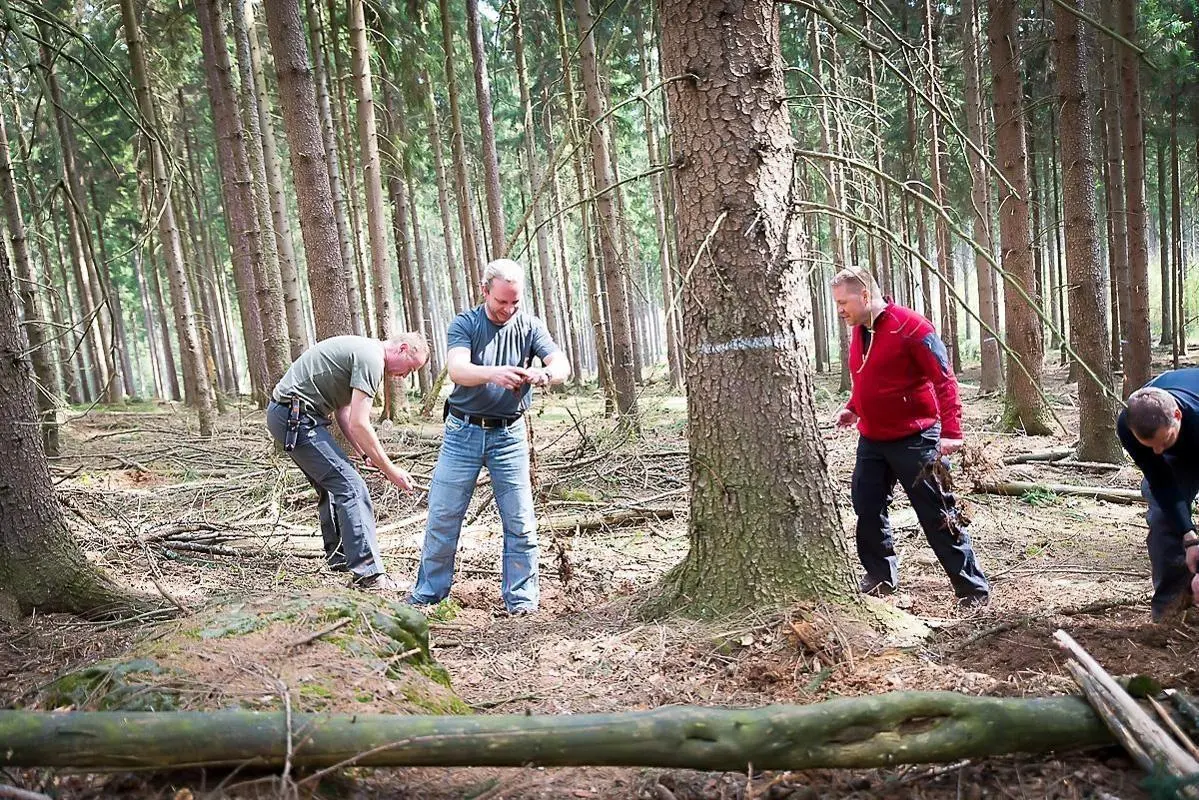 Drei Personen stehen im Wald und diskutieren über eine Karte auf dem Boden