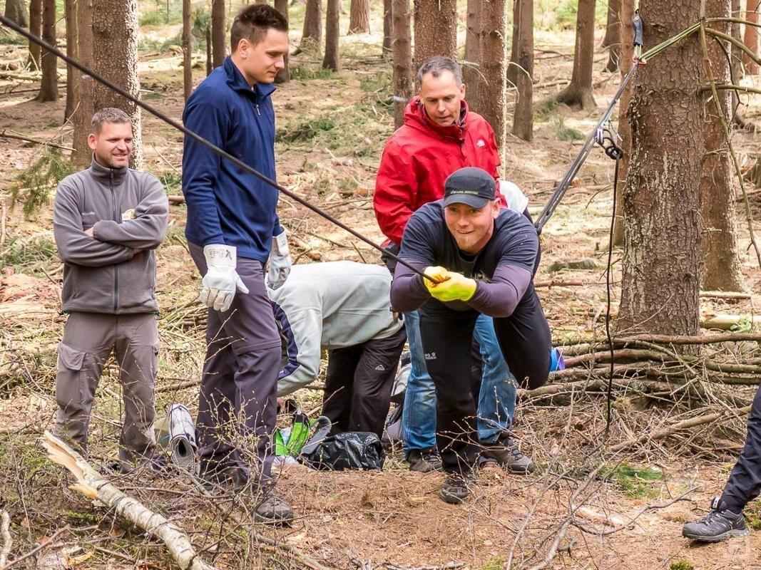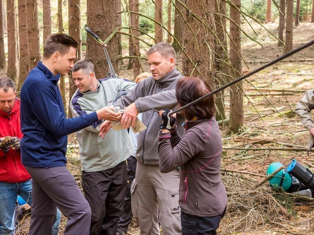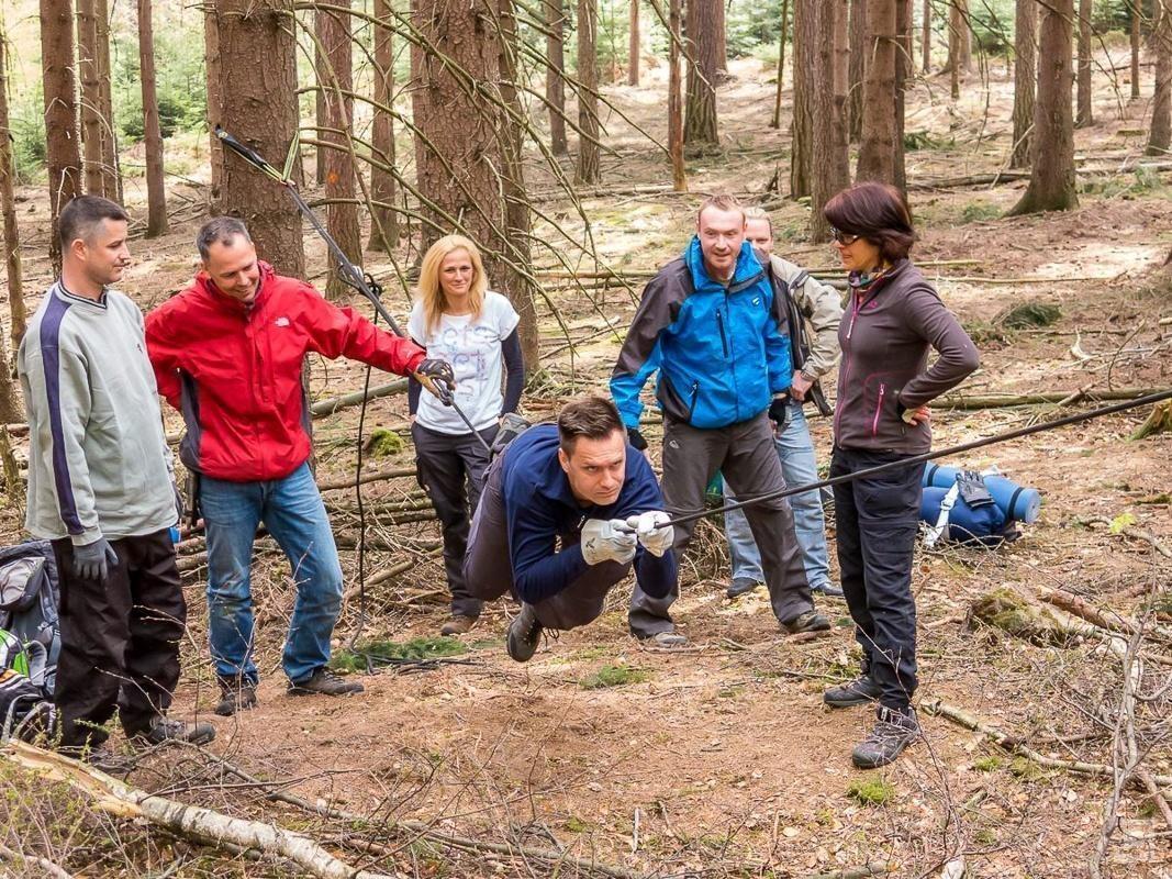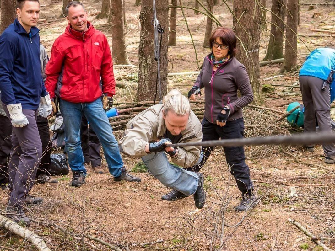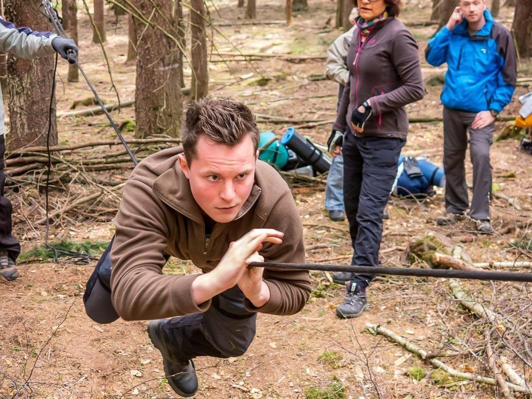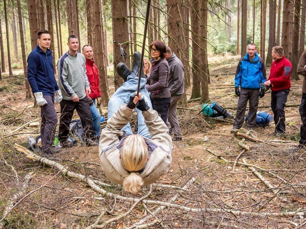 Gruppendynamik bei einer praktischen Übung im Wald mit Seil und Ausrüstung