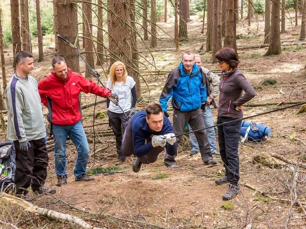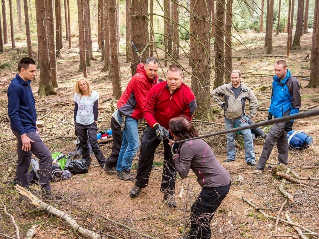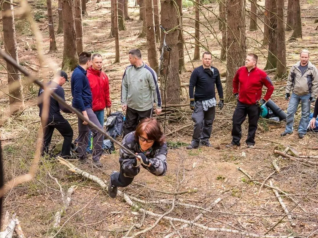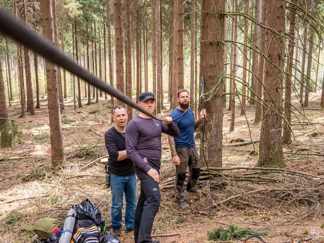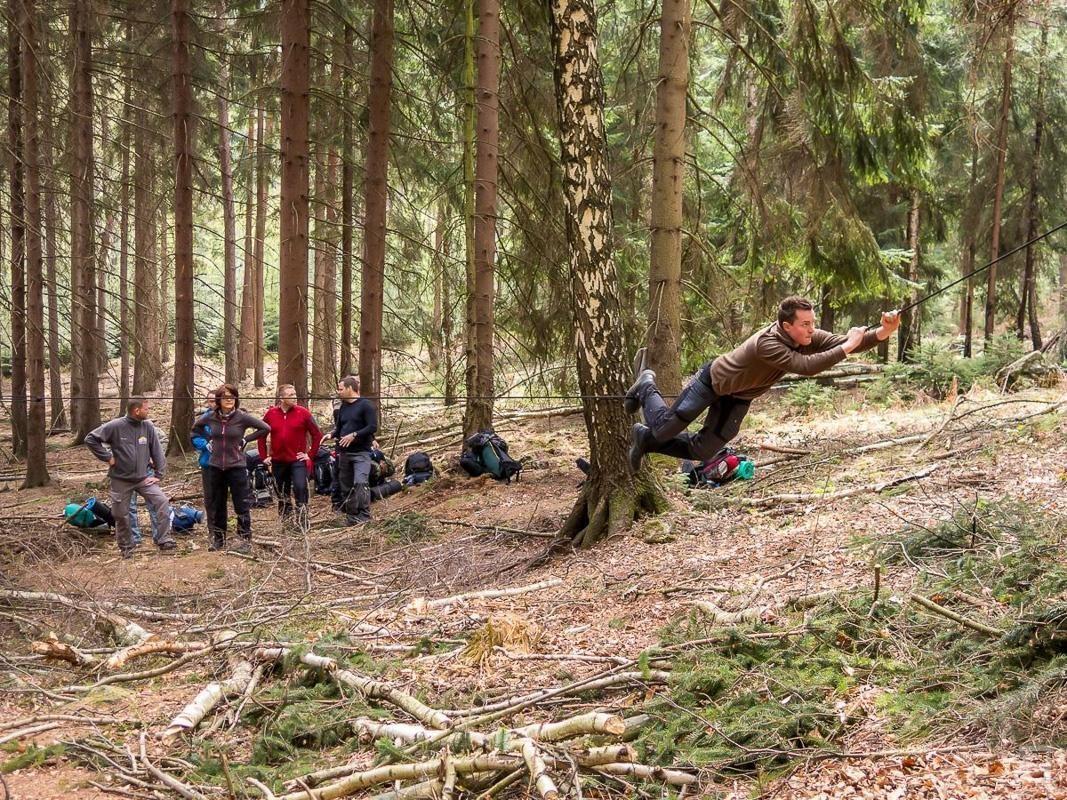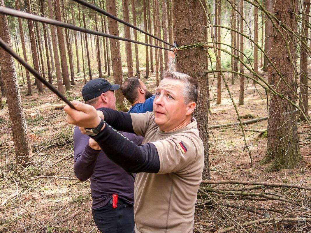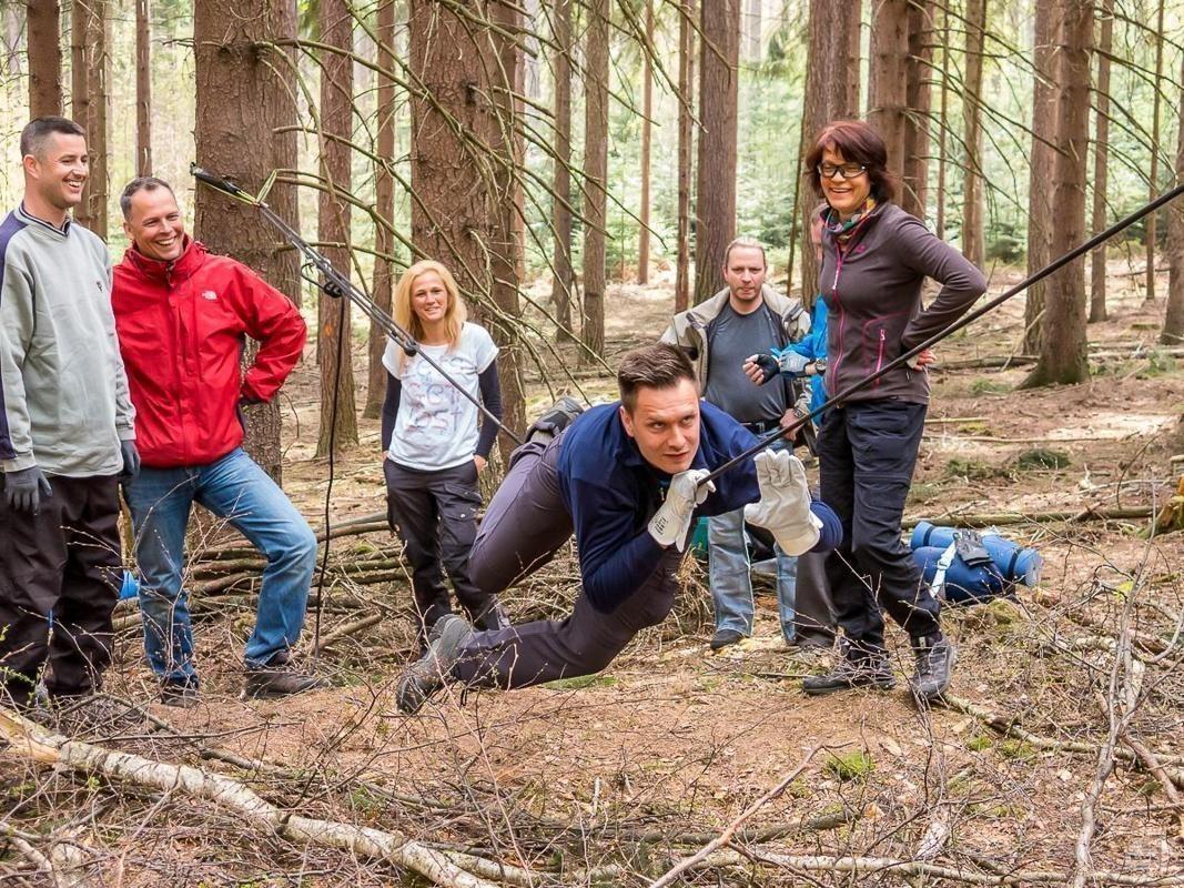 Gruppendynamik bei einer praktischen Übung im Wald mit Seil und Ausrüstung