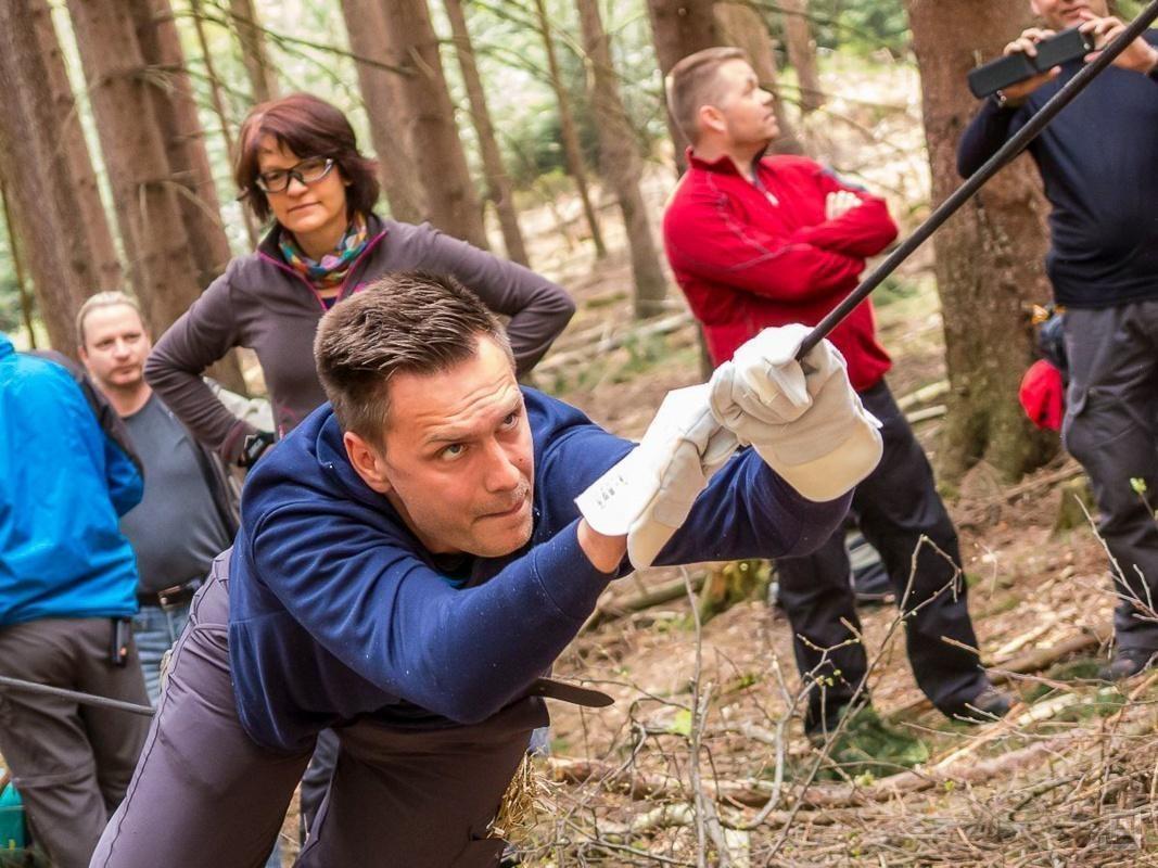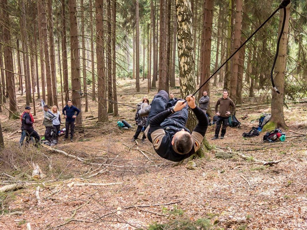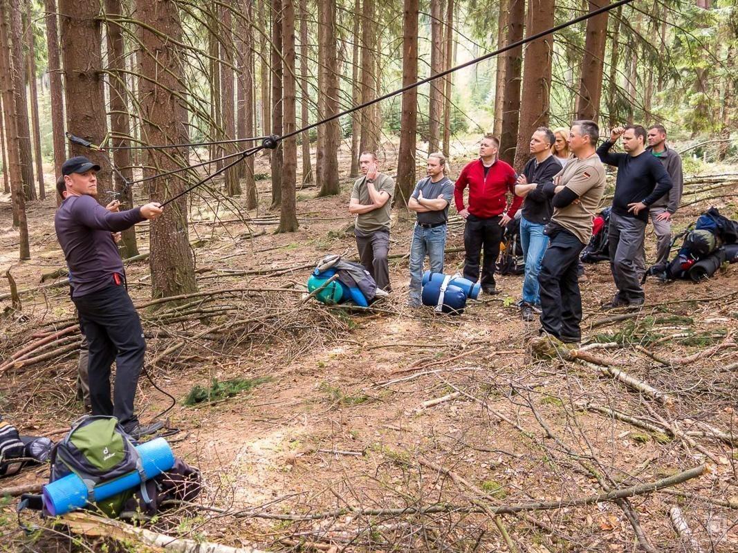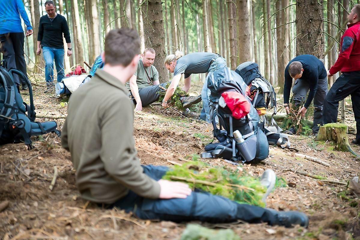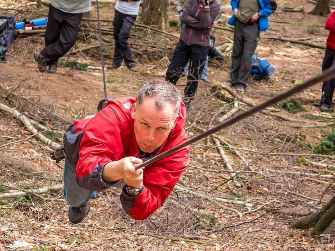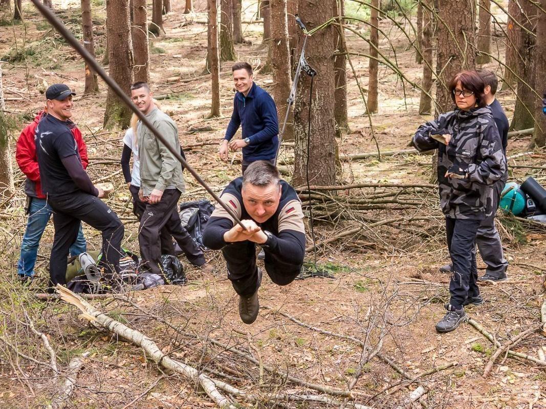 Gruppendynamik bei einer praktischen Übung im Wald mit Seil und Ausrüstung