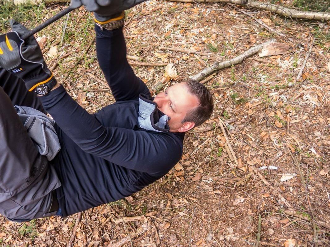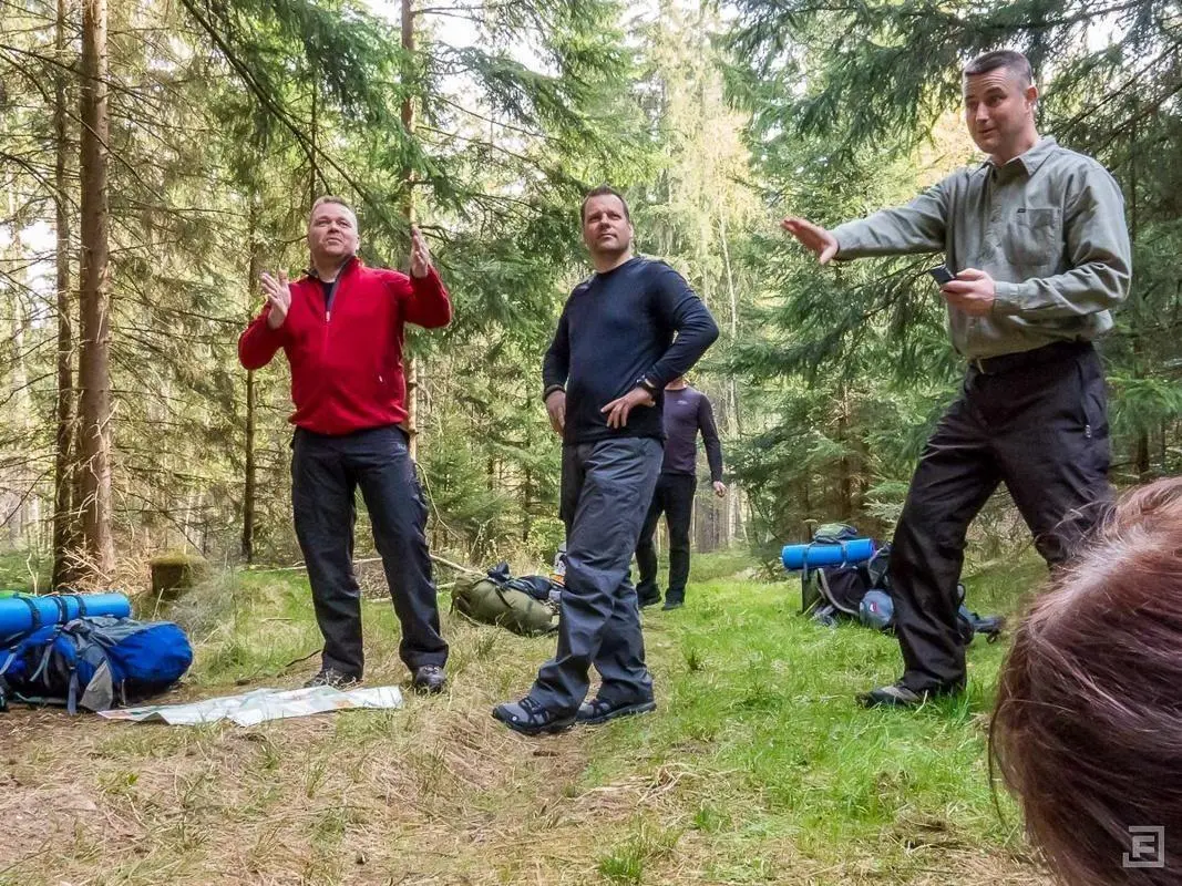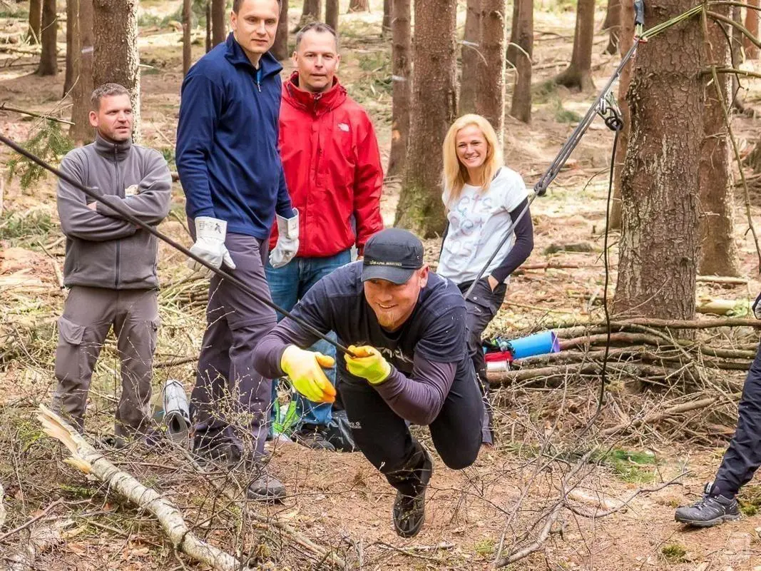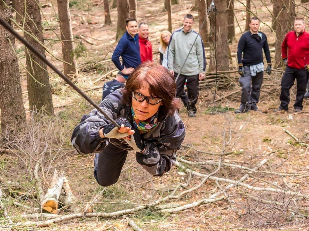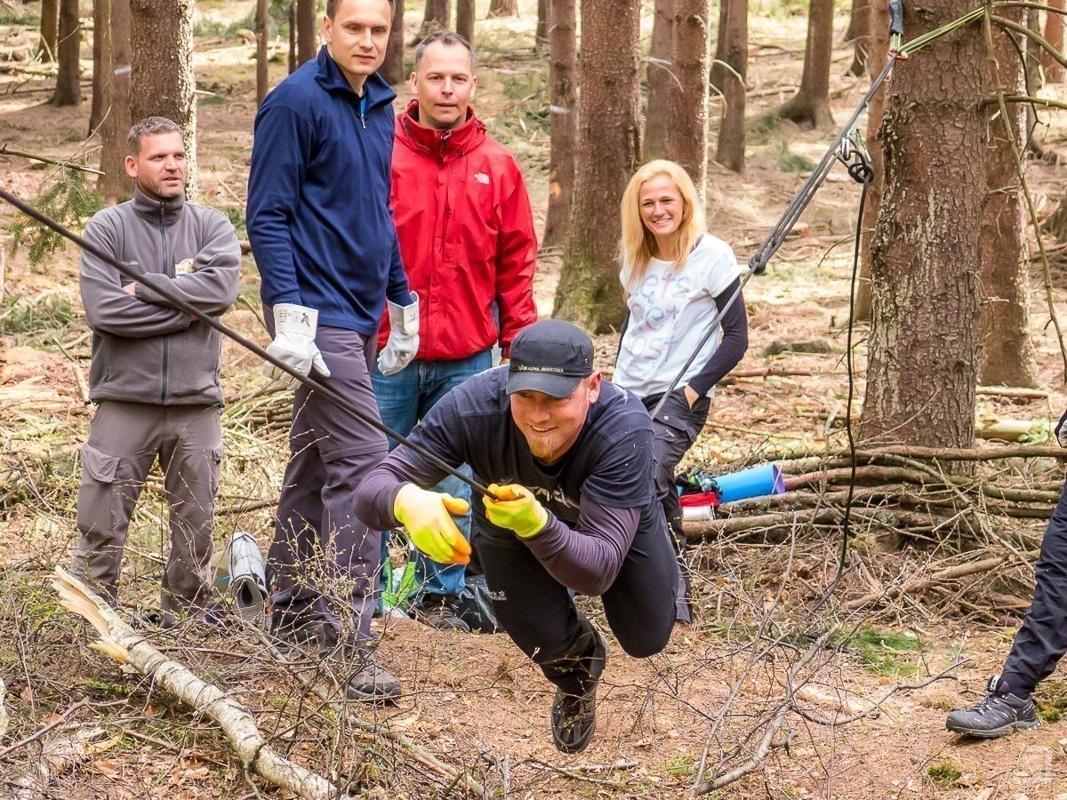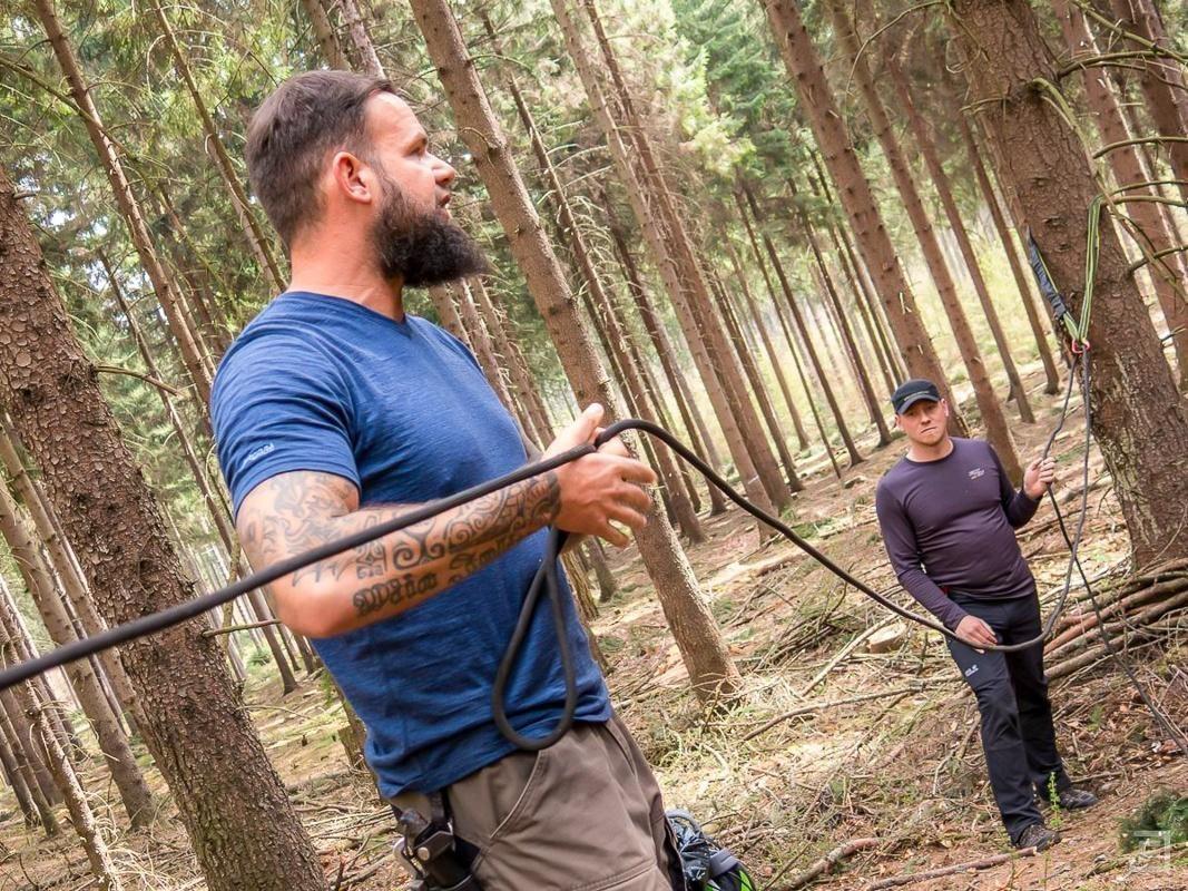 Gruppendynamik bei einer praktischen Übung im Wald mit Seil und Ausrüstung