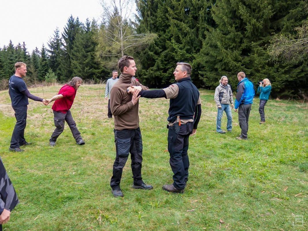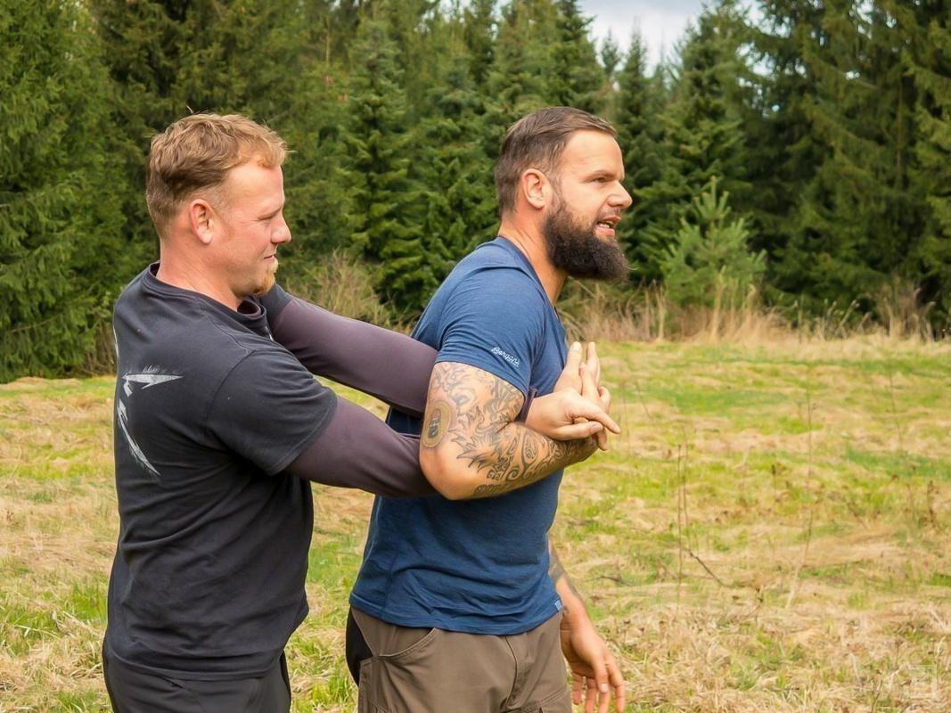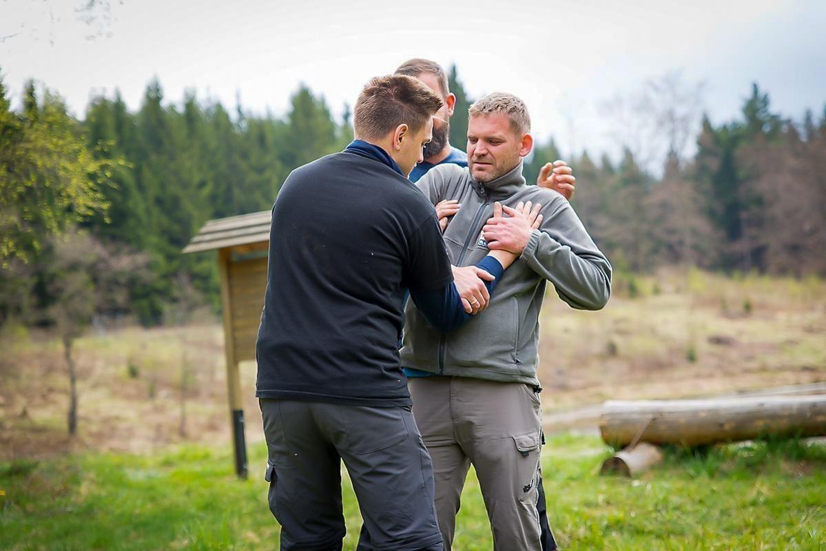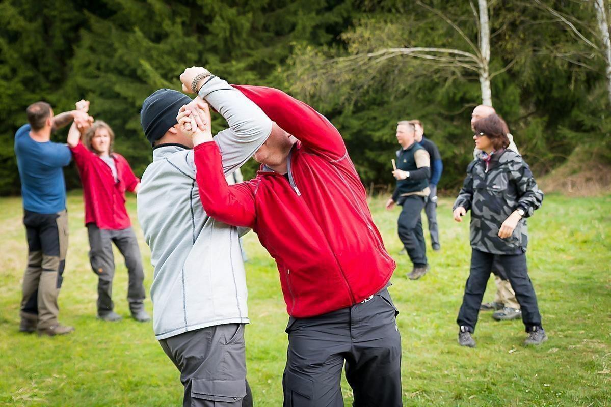 Kampftraining mit mehreren Personen im Freien, einer hält den Arm eines anderen fest