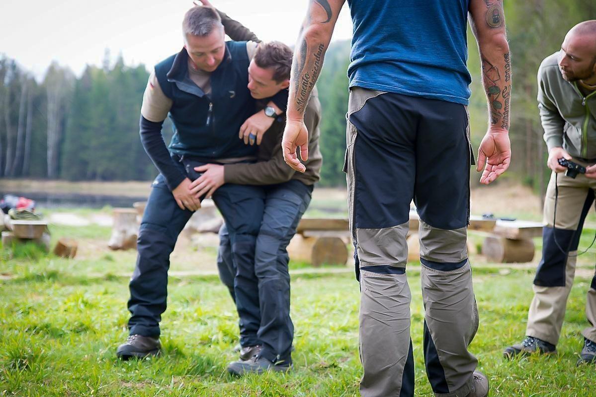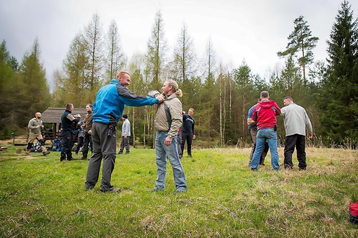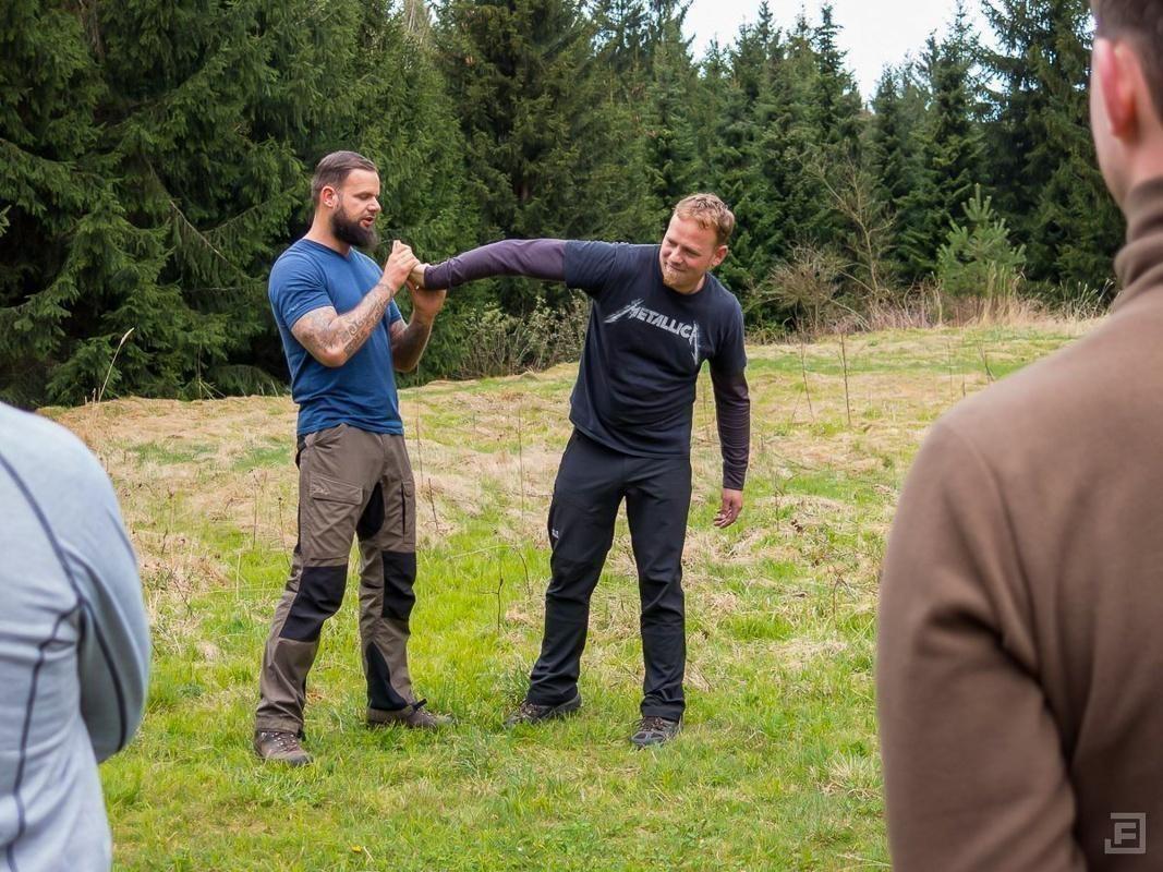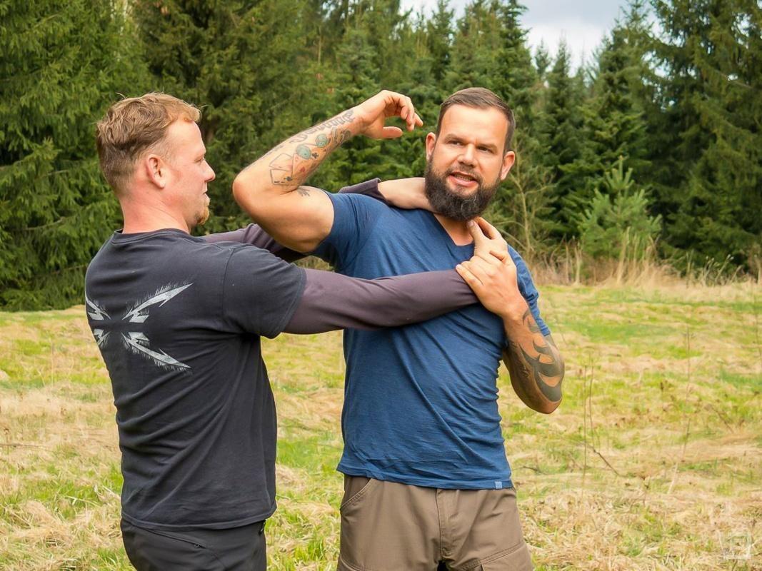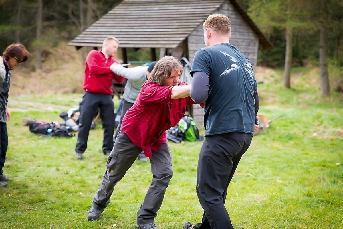 Kampftraining mit mehreren Personen im Freien, einer hält den Arm eines anderen fest