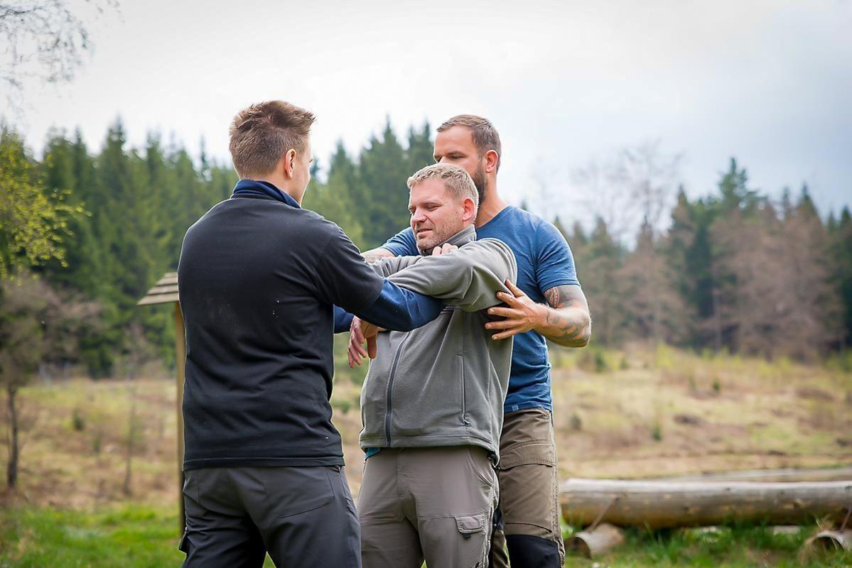 Drei Personen üben eine Technik zur Selbstverteidigung im Freien