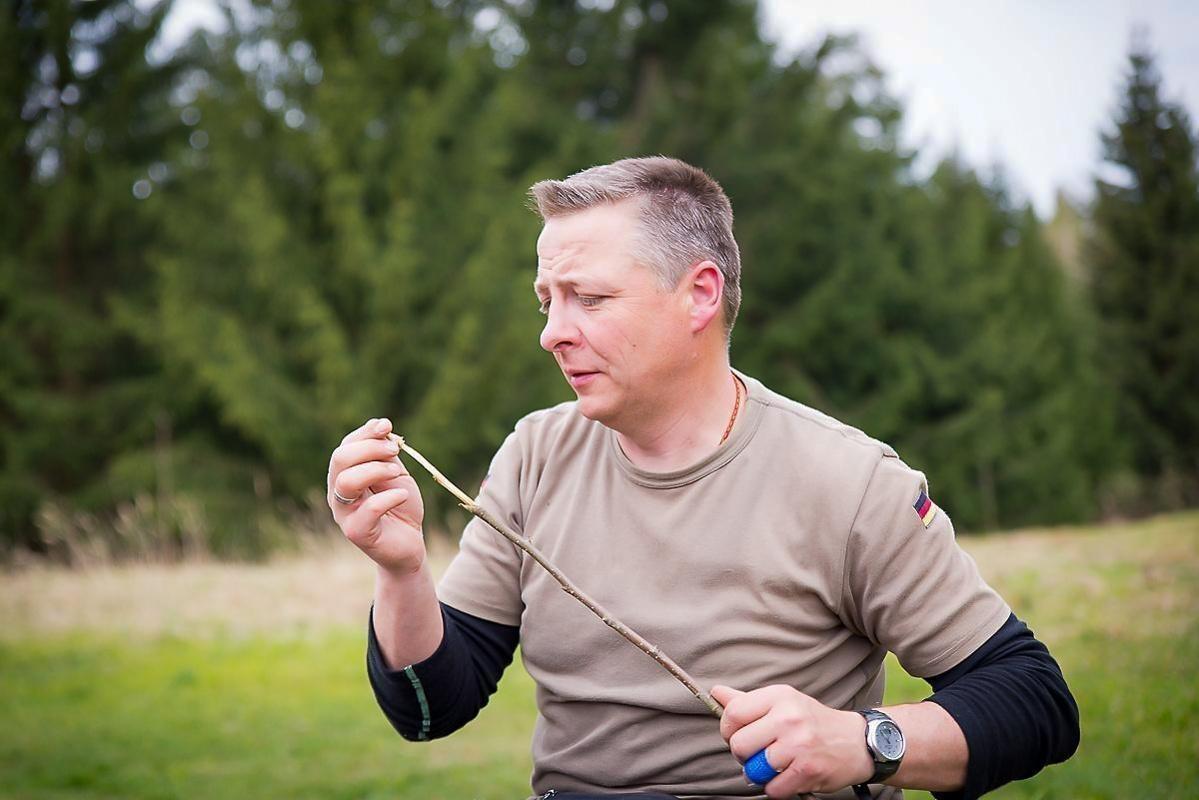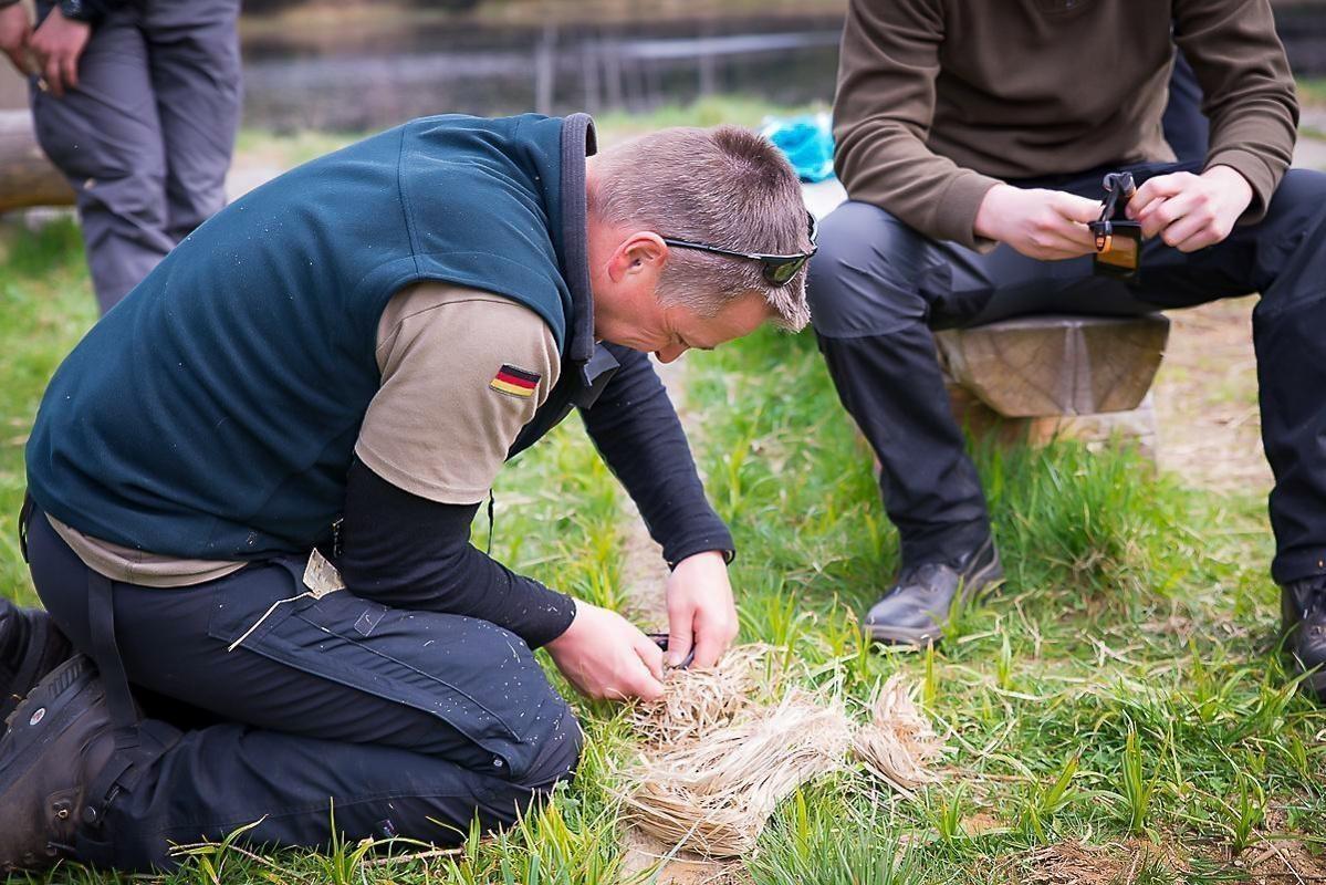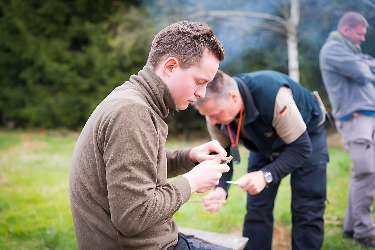 Die Teilnehmer beschäftigten sich auch mit der Zubereitung von Insekten als Notnahrung, was eine wichtige Fertigkeit im Survival-Training darstellt. Während des Kurses wurden verschiedene Techniken vermittelt, um die Sicherheit im Umgang mit dem Messer zu gewährleisten. Das Schnitzen von Holzstücken diente nicht nur der praktischen Anwendung, sondern auch der Förderung von Geschicklichkeit und Präzision. Zudem übten die Gruppen das Bergen und die Tragetechniken im Rahmen der Ersten Hilfe, was für Notfallsituationen von Bedeutung ist.