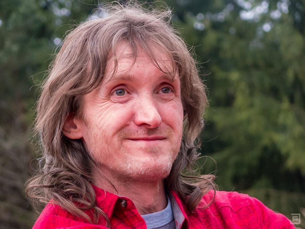 Ein Mann in roter Jacke lächelt am Ufer eines Gewässers